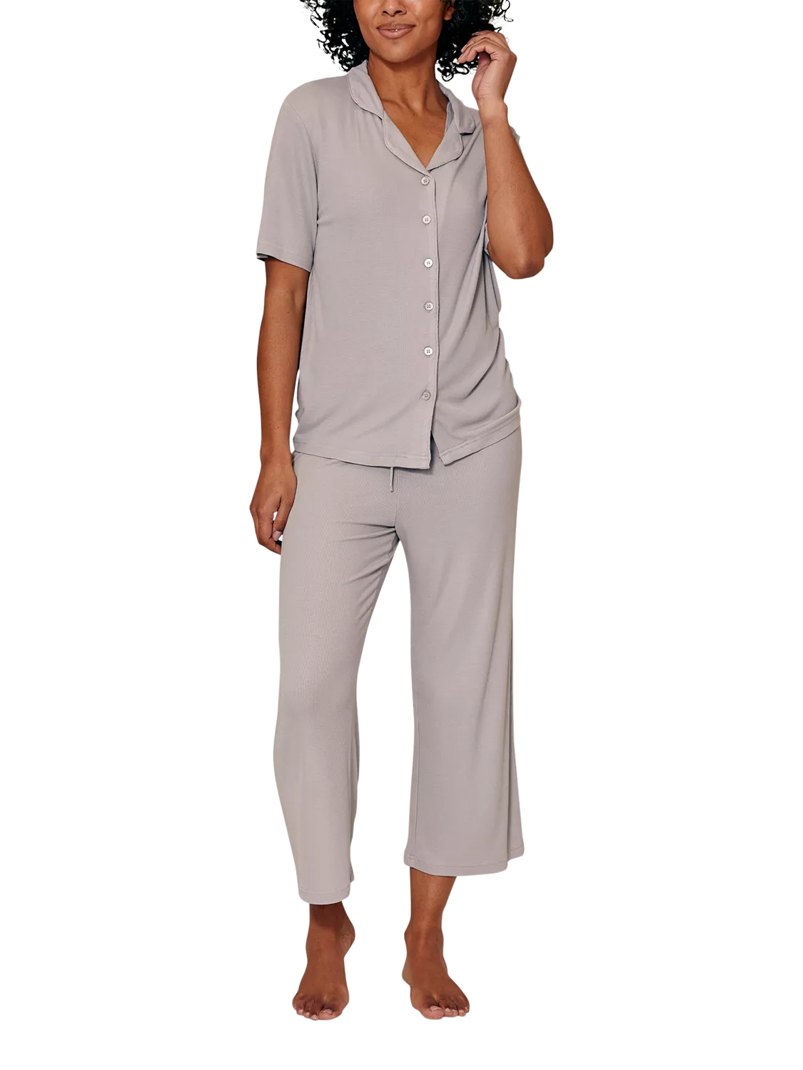 Made from ultra-soft, fabric, this pyjama set includes a short-sleeve button-up shirt with a chic revere collar and tonal buttons for a refined touch. The cropped, mid-calf capri trousers feature a straight-leg fit and an adjustable drawstring waist for all-night comfort. Designed in a luxuriously soft ribbed texture, this lightweight set is perfect for lounging or casual outings.