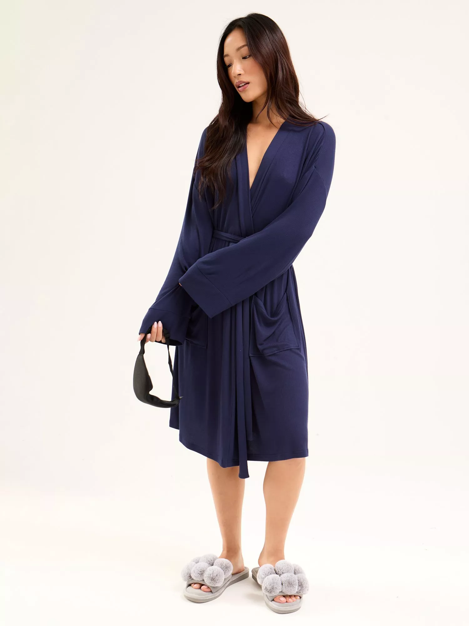 Designed with a just-below-the-knee length for the perfect balance of coverage and ease, this robe features a matching internal tie for added security and an external waist tie for a customisable fit. The standard fit and super-soft ribbed fabric create a beautifully draped silhouette, making it the ideal lightweight layer for relaxed mornings and cosy evenings.