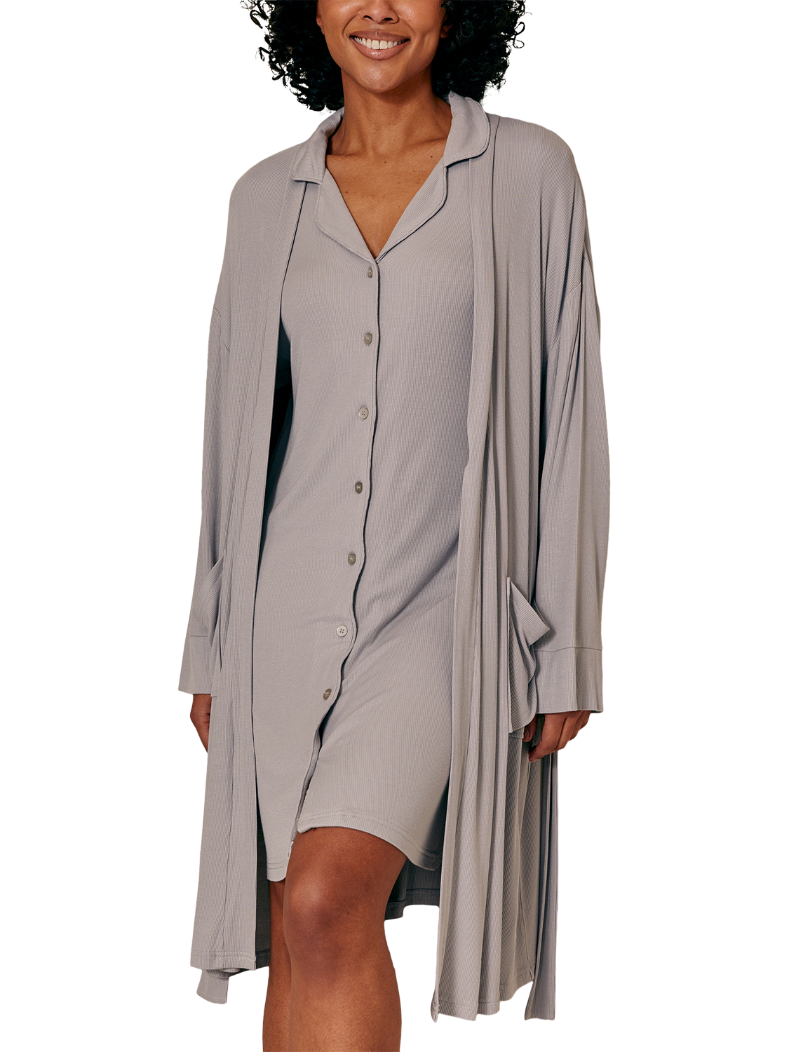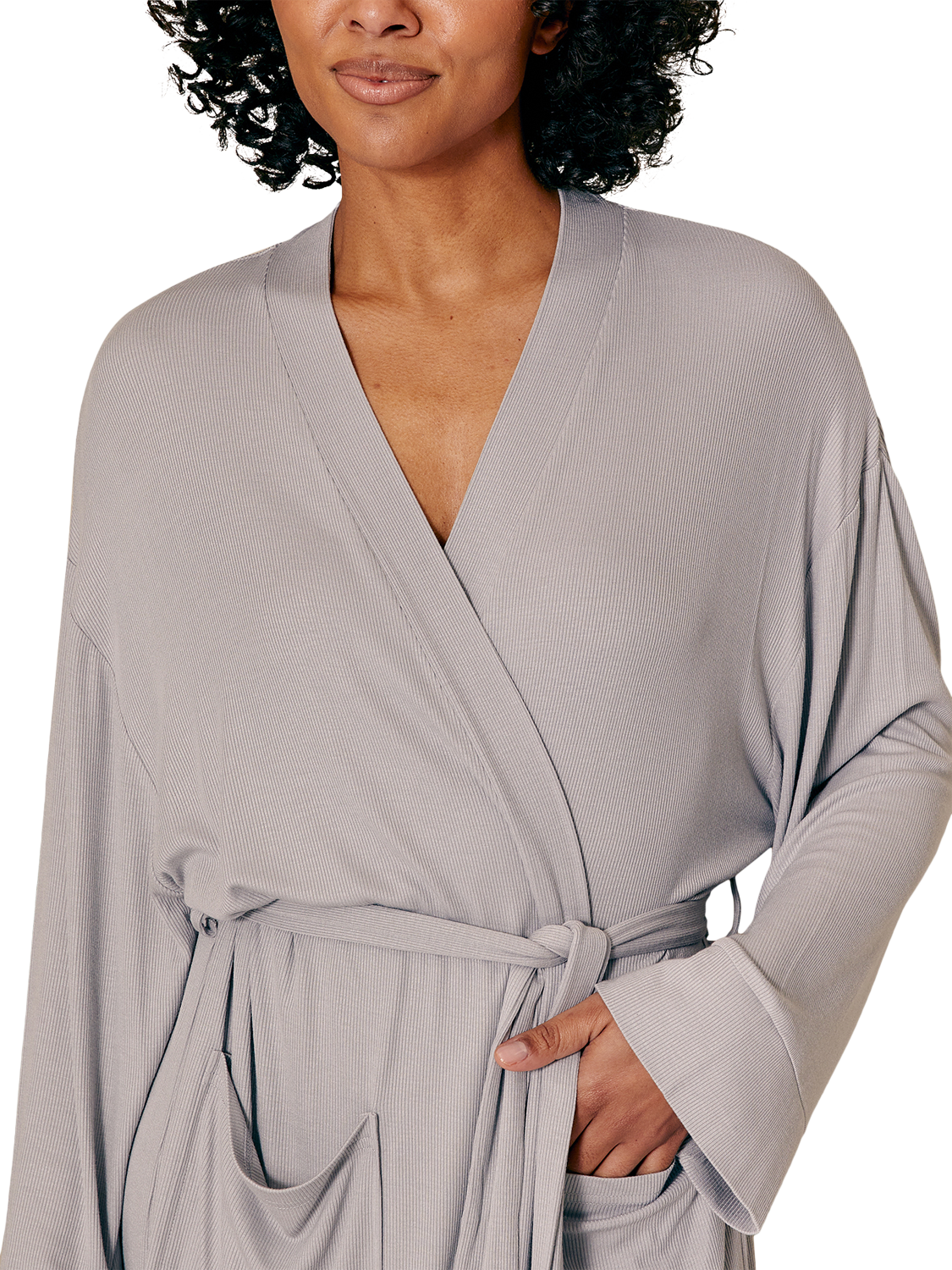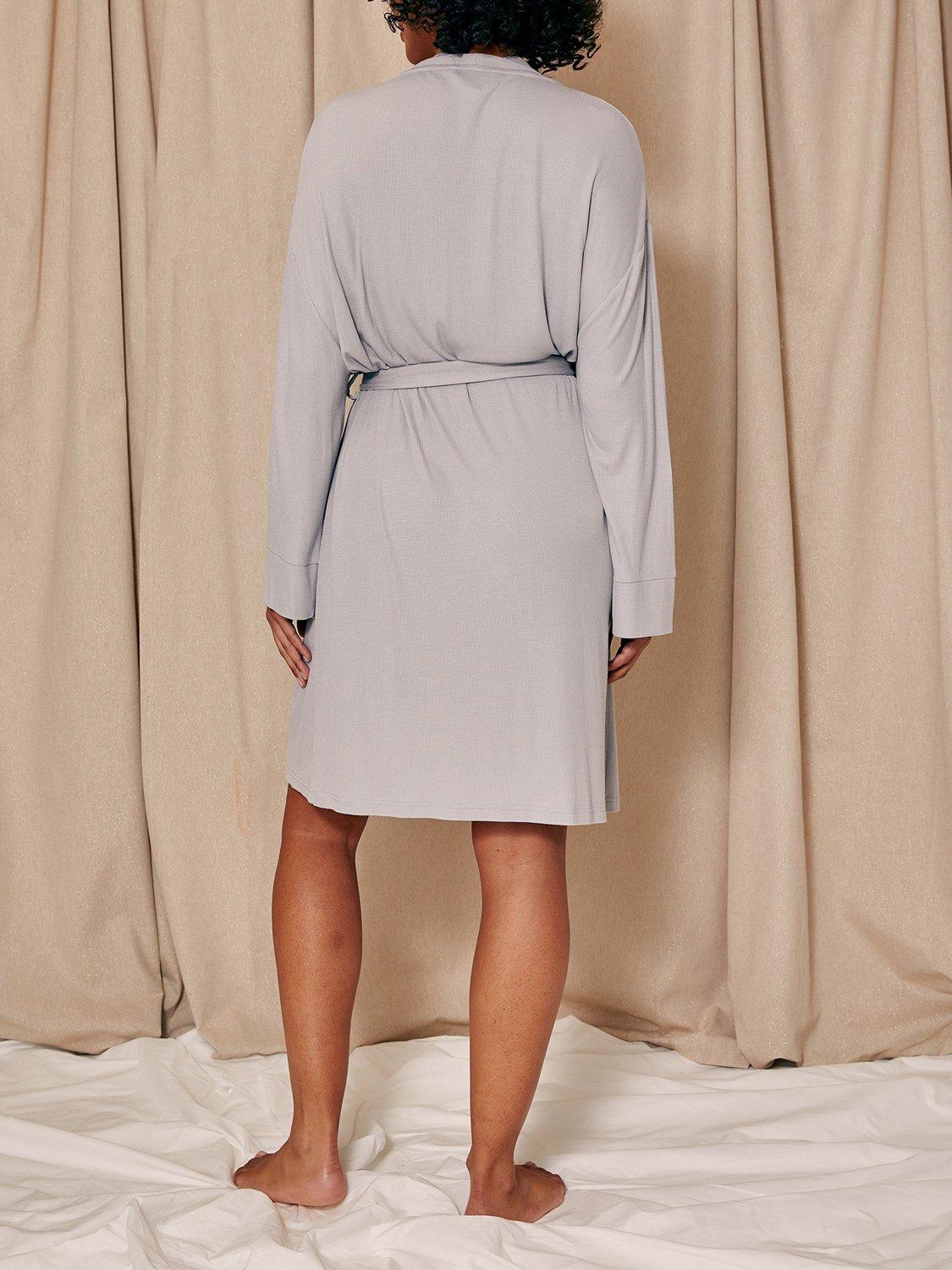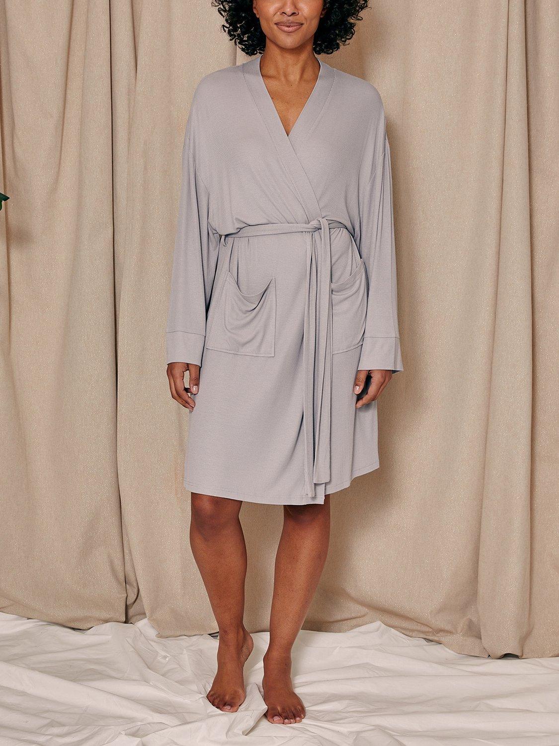 Designed with a just-below-the-knee length for the perfect balance of coverage and ease, this robe features a matching internal tie for added security and an external waist tie for a customisable fit. The standard fit and super-soft ribbed fabric create a beautifully draped silhouette, making it the ideal lightweight layer for relaxed mornings and cosy evenings.