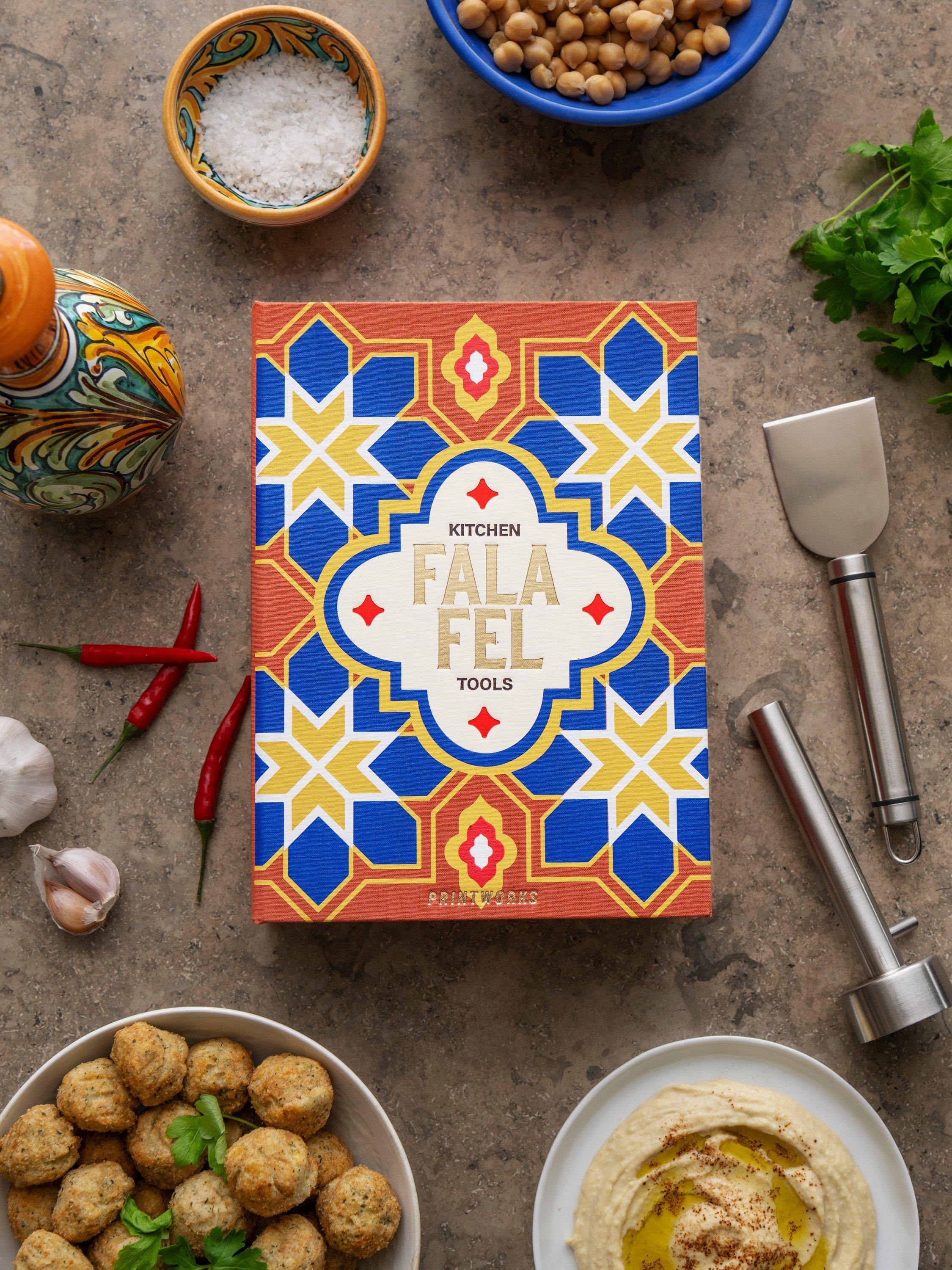 Discover the essential kit for creating falafel from scratch – a stylish toolbox presented in a book-like box, perfect for food explorers. It also serves as a decorative piece in your kitchen when stored alongside cookbooks.