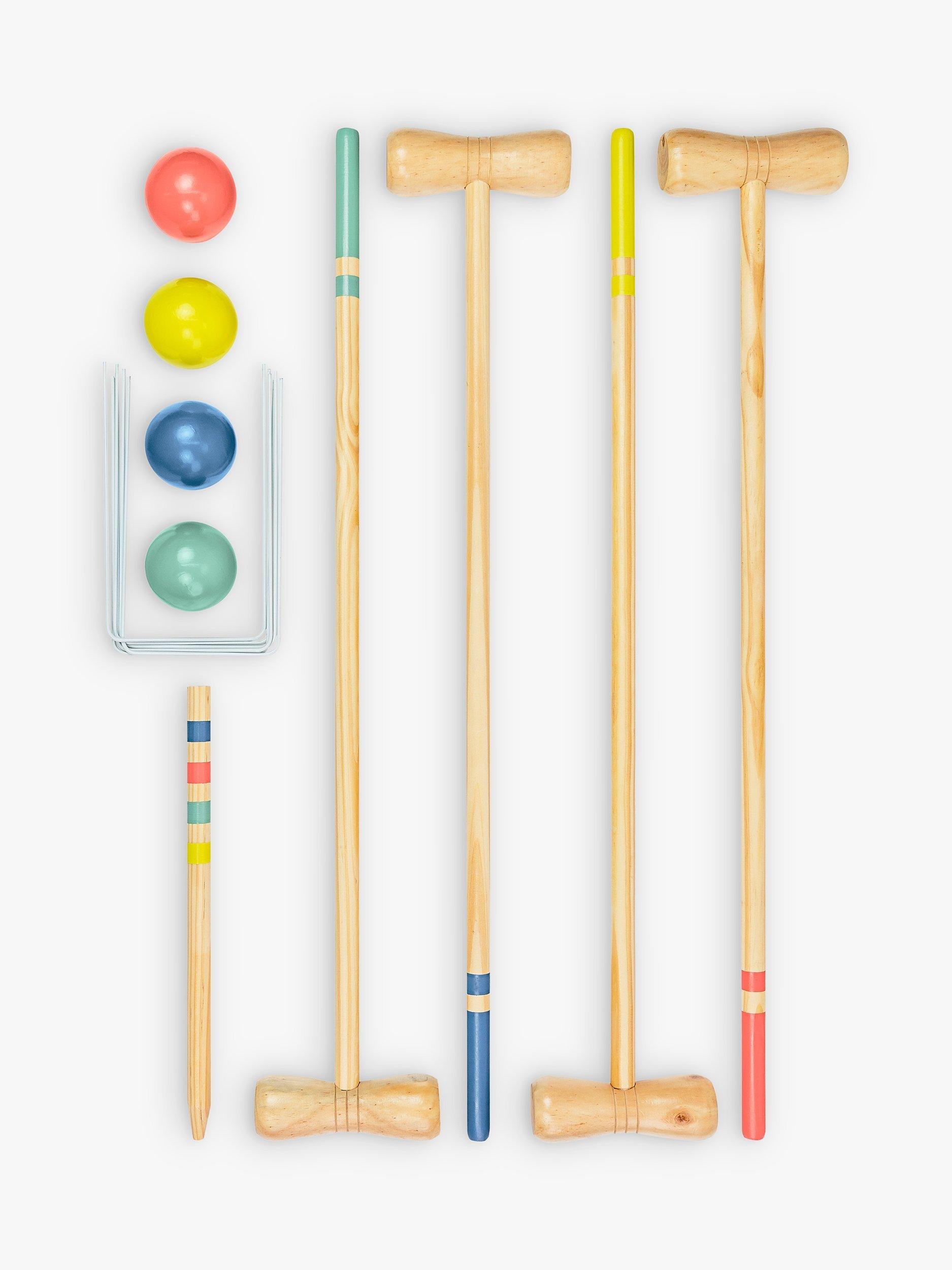 Set contains: Four wooden mallets, four wooden balls, six wire hoops, wooden peg and instruction sheet