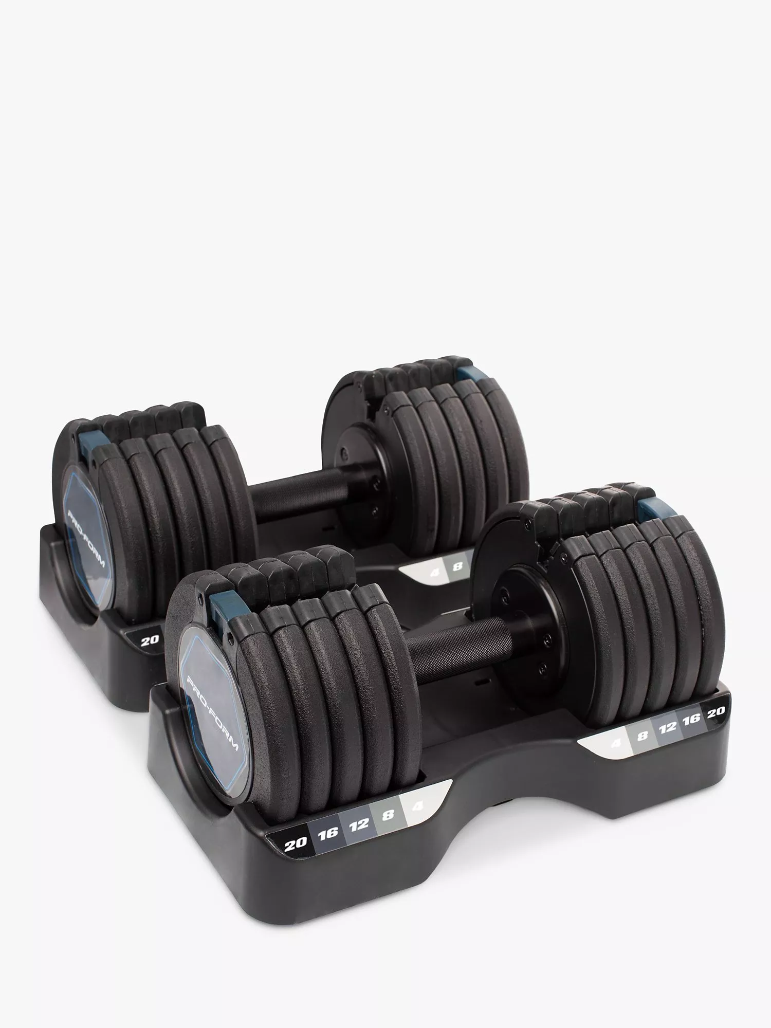 Constructed from durable steel, the ProForm 20Kg Select-A-Weight Dumbbell Pair are five dumbbells in one. Target nearly every muscle group, from lower body to upper body, with the weight of your choice.