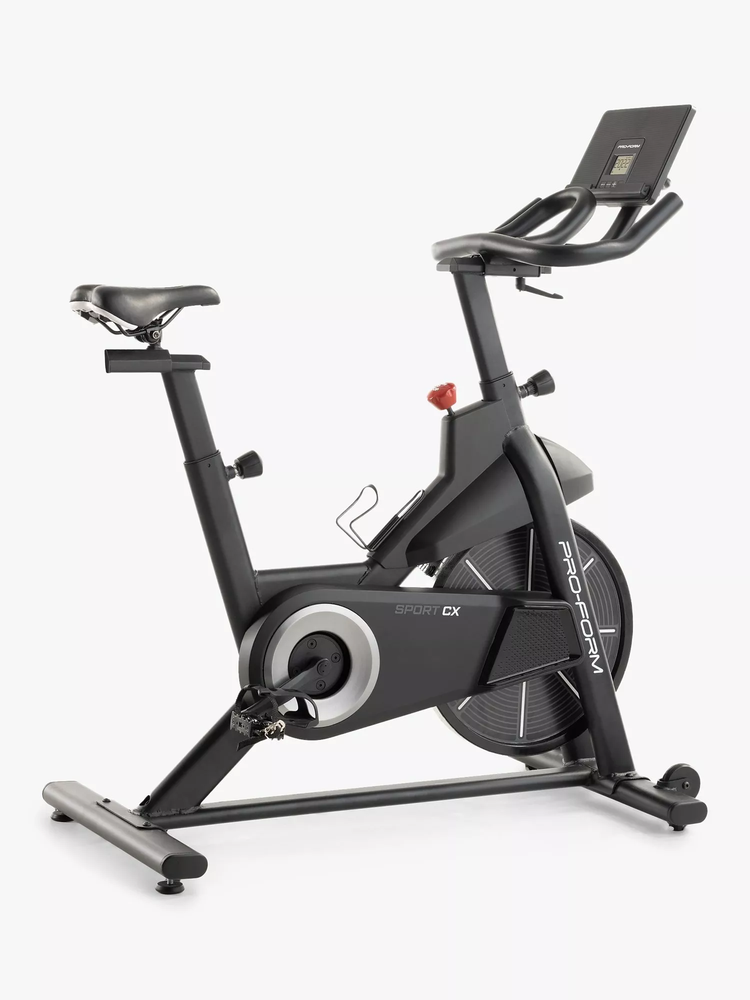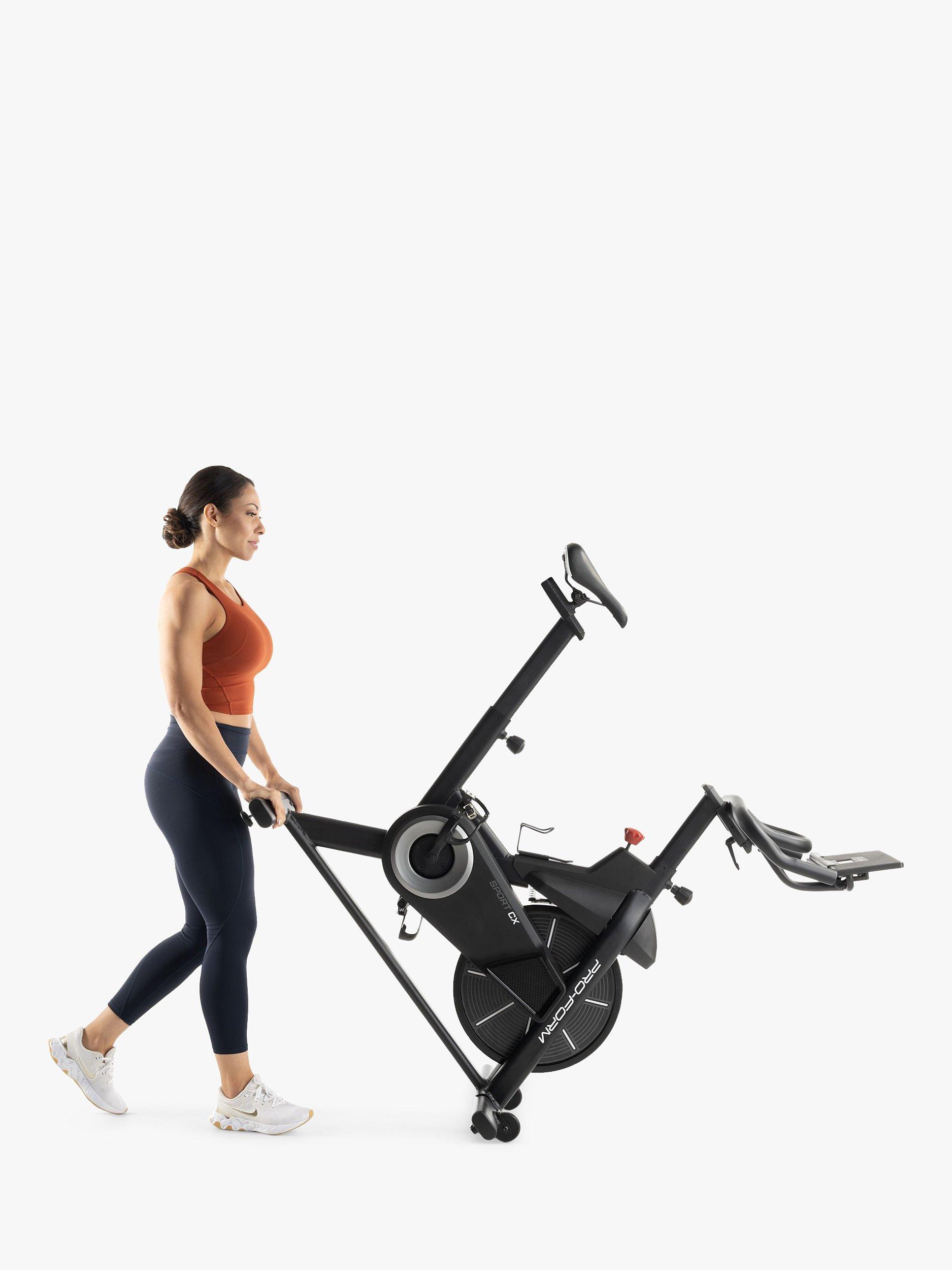 Equipped with an 11kg inertia-enhanced flywheel and 16 levels of SMR Silent Magnetic Resistance, the ProForm Sport CX is a smooth, effective ride. Both the ergonomic padded saddle and the non-slip multi-position handlebar are adjustable vertically and horizontally, and the Sport CX also benefits from pedals with toe cages and straps. View your workout stats—including your Watts power readout—on the large 1-window LCD display, or utilise the tablet holder in front of the screen.