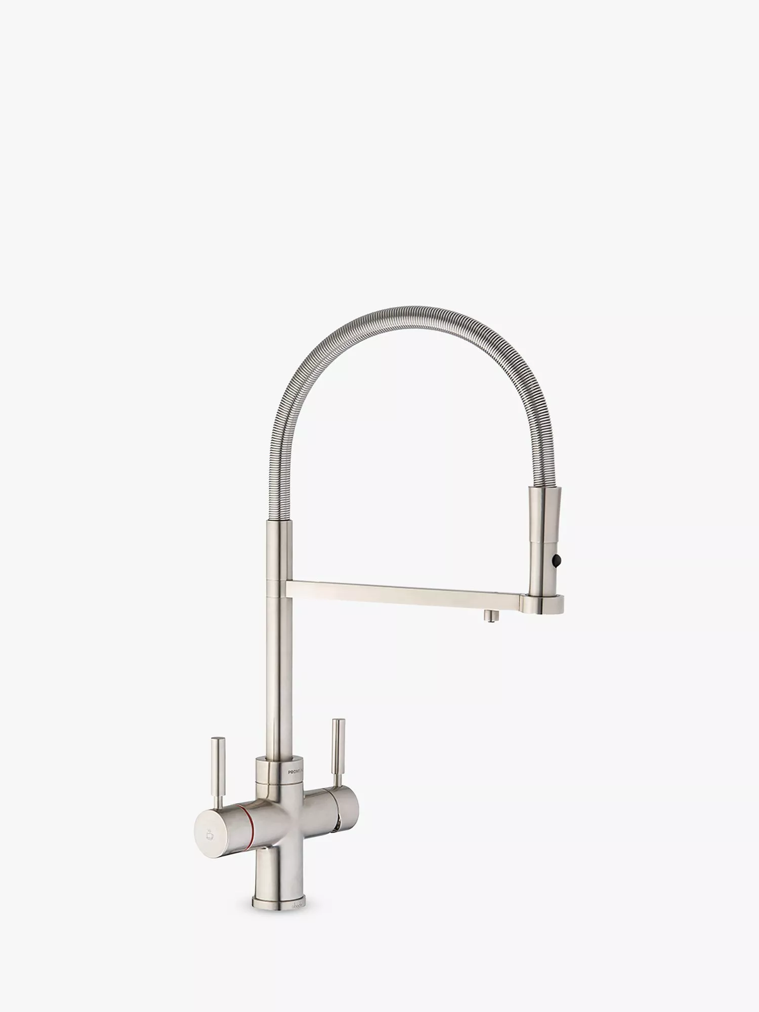 Pronteau Professional blends design and functionality and adds a touch of industrial style to your kitchen. A streamlined and safe way to instantly access steaming hot water, this kitchen tap saves time, energy and space. The dynamic dual lever styling and sleek semi-professional design give you a great deal of flexibility, with a 360-degree spout and pull-around hose feature for getting into the corners of a sink and making light work of everyday cleaning.