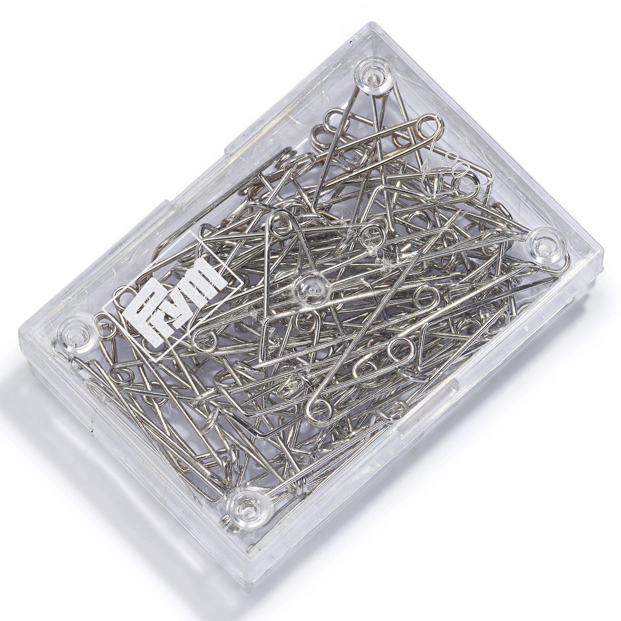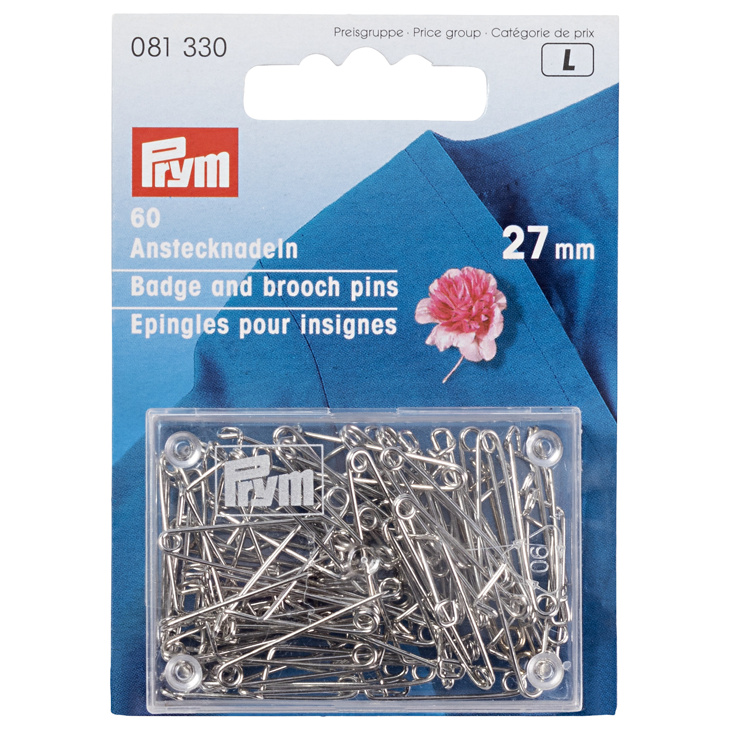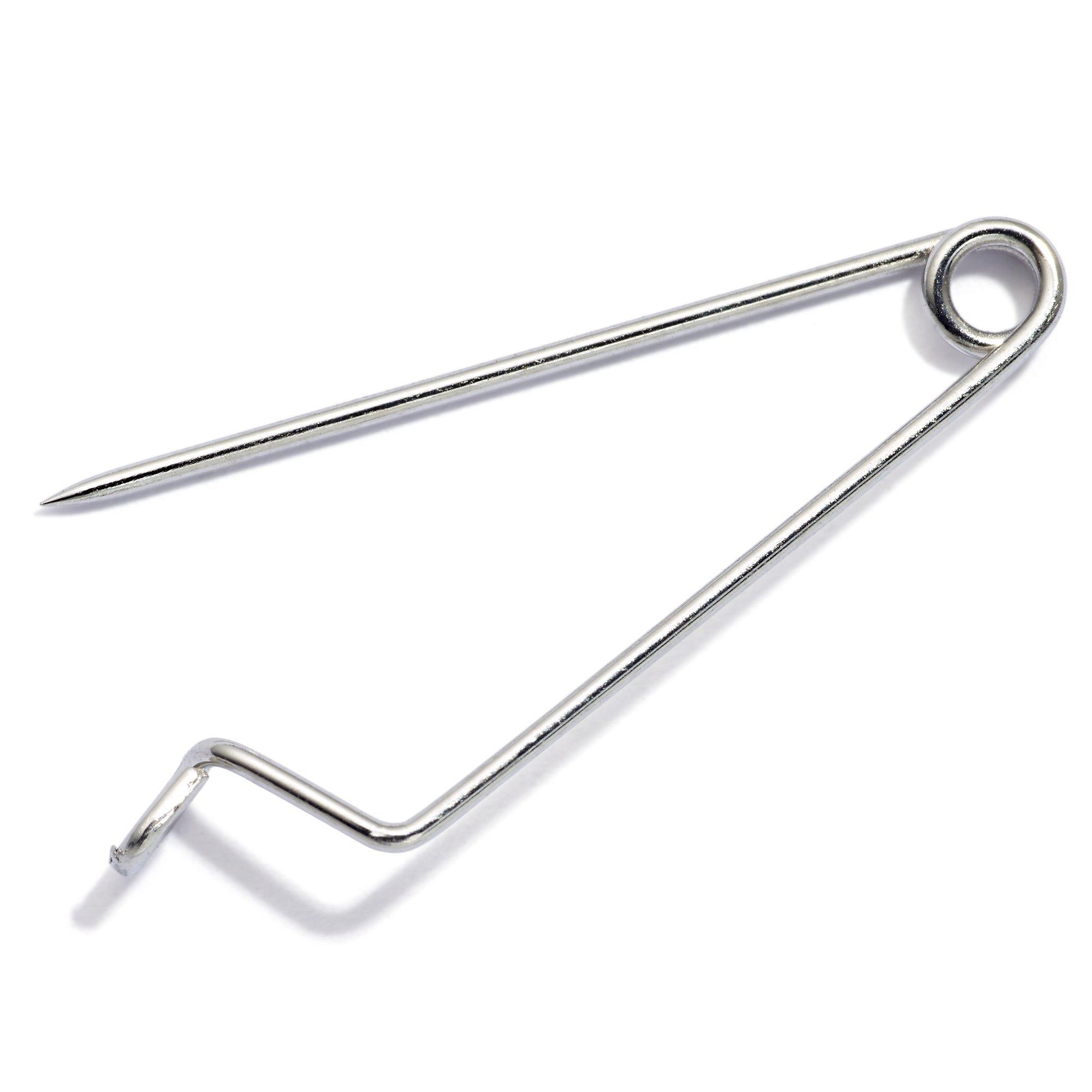 A pack of 60 badge and brooch pins made of mild steel that is rust protected.