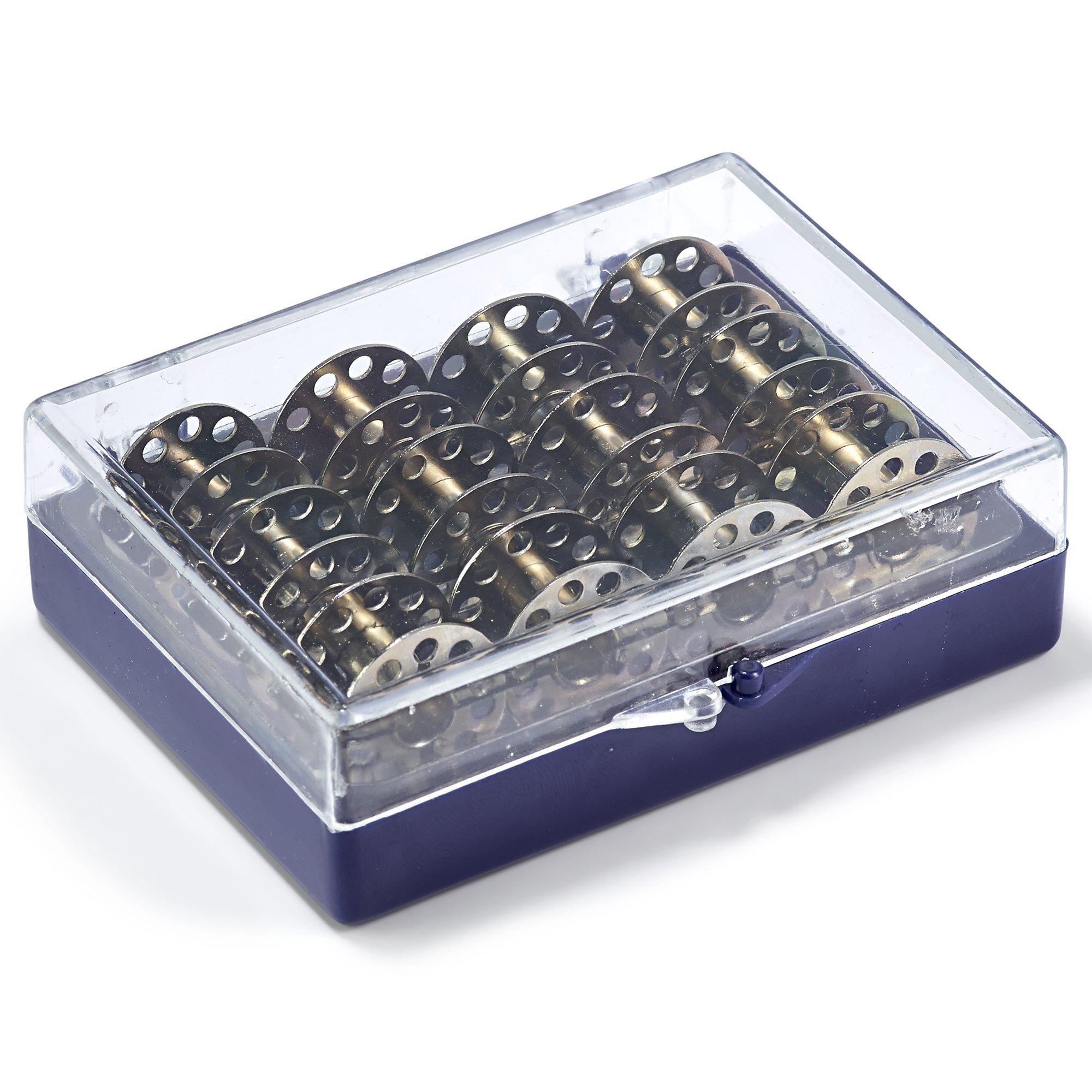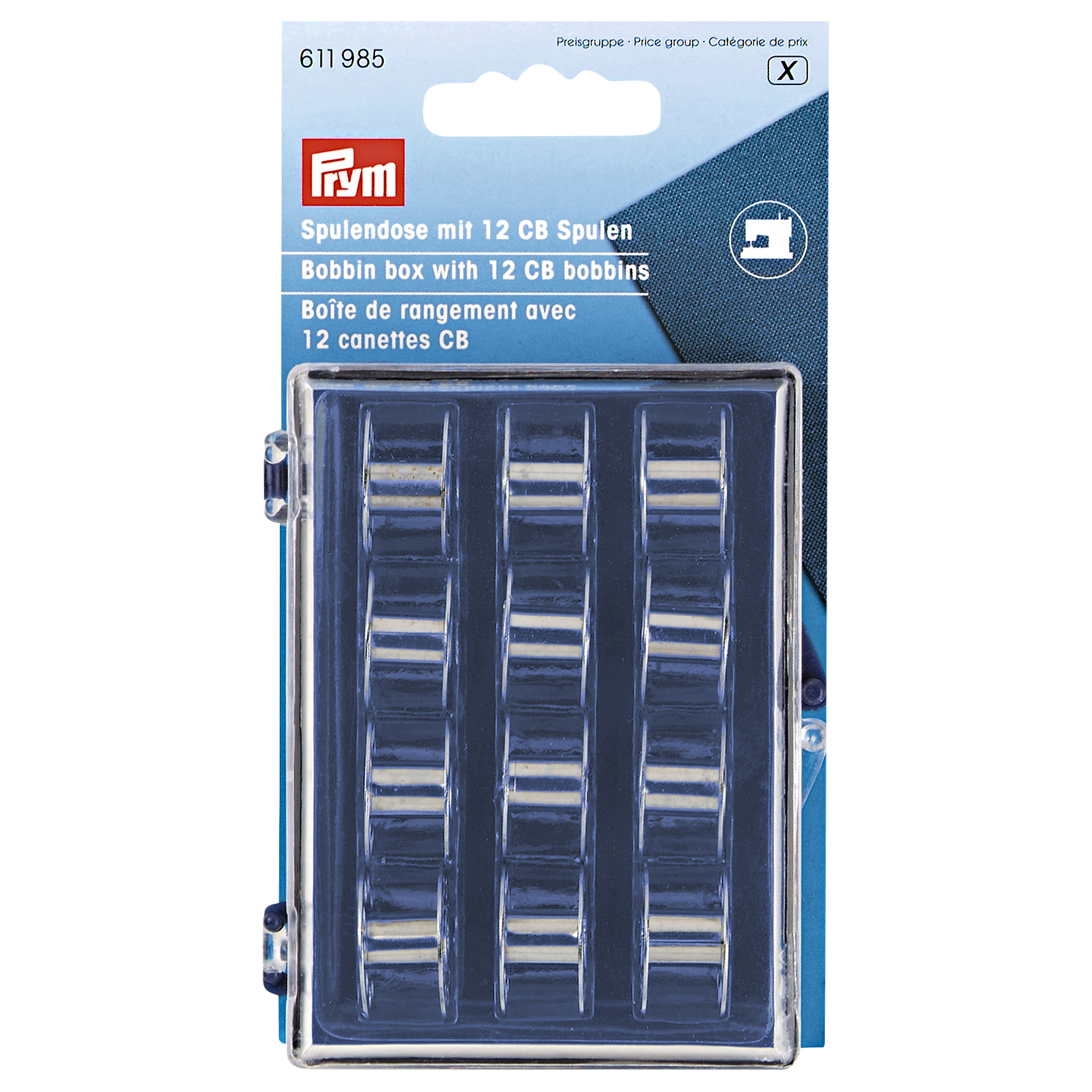 Bobbin box, from the well known Prym range of sewing accessories, containing 12 CB metal bobbins.