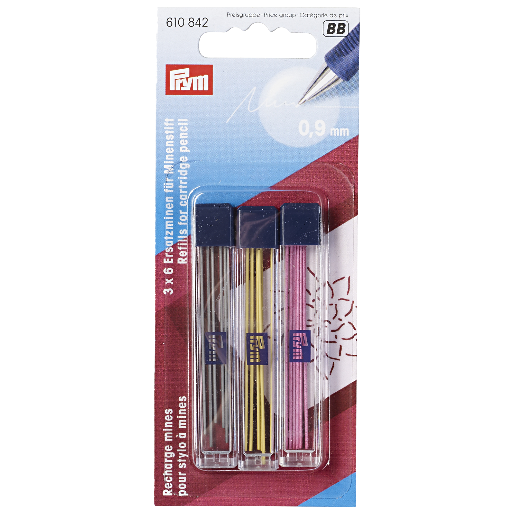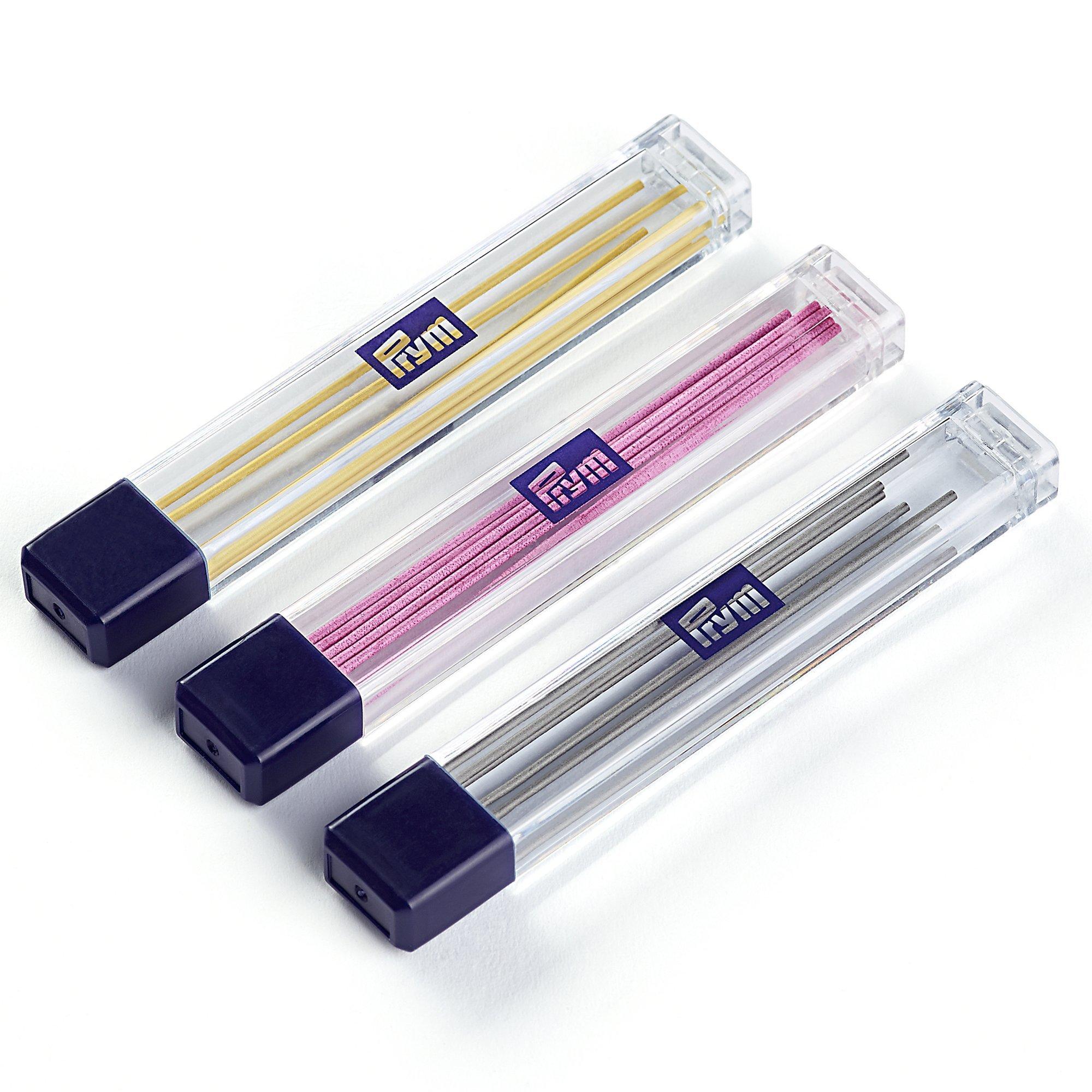 9mm refills for use with the Prym 610840 Cartridge Pencil. Use the yellow or pink colours on medium to dark fabrics, the black lead of lighter fabrics. When you wash the garment, all markings will be removed.