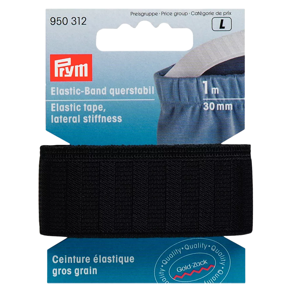 Gold Zack woven waistband tape. The elastic material ensures a comfortable fit when put onto clothing. Size: 30mm x 1m
