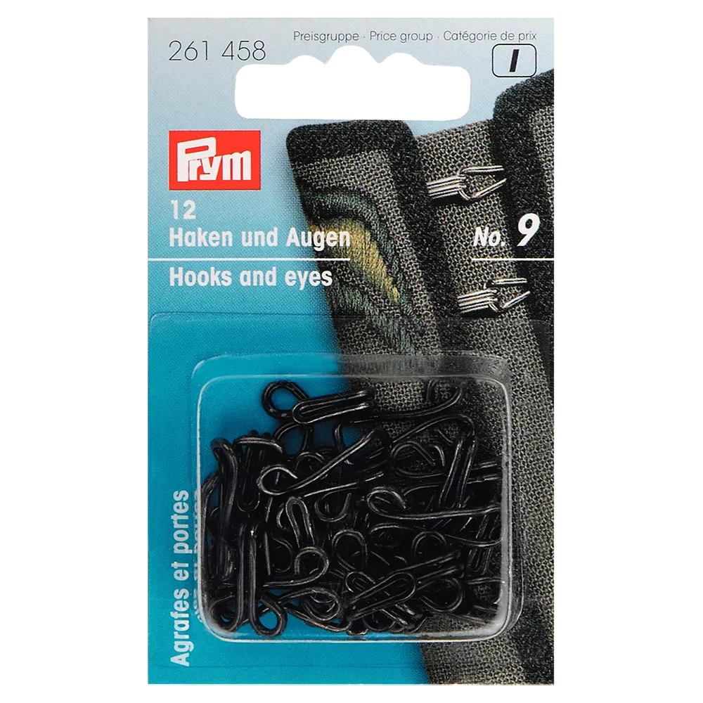 A pack of 12 black hooks and eyes for jerkins. Size 9, rust protected.