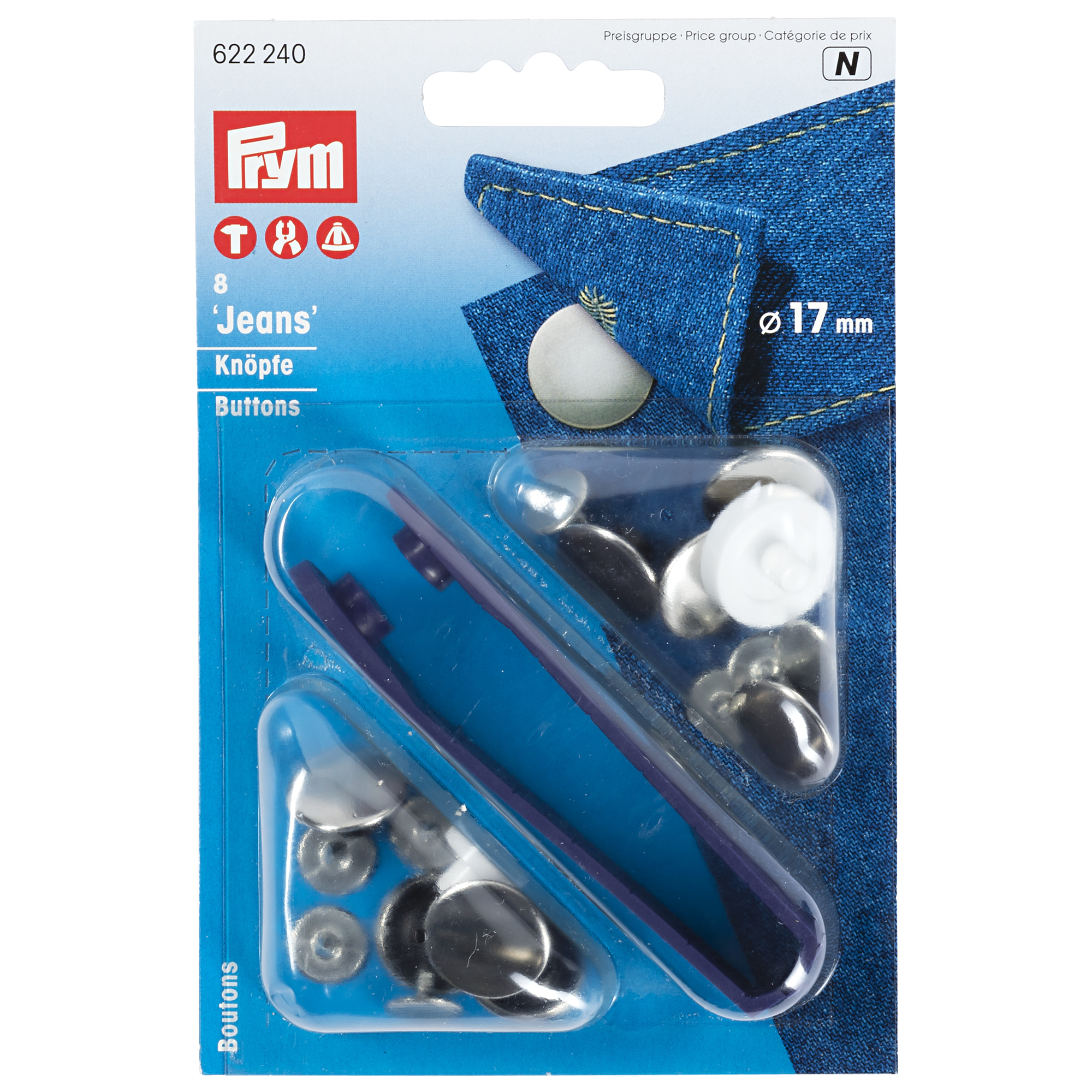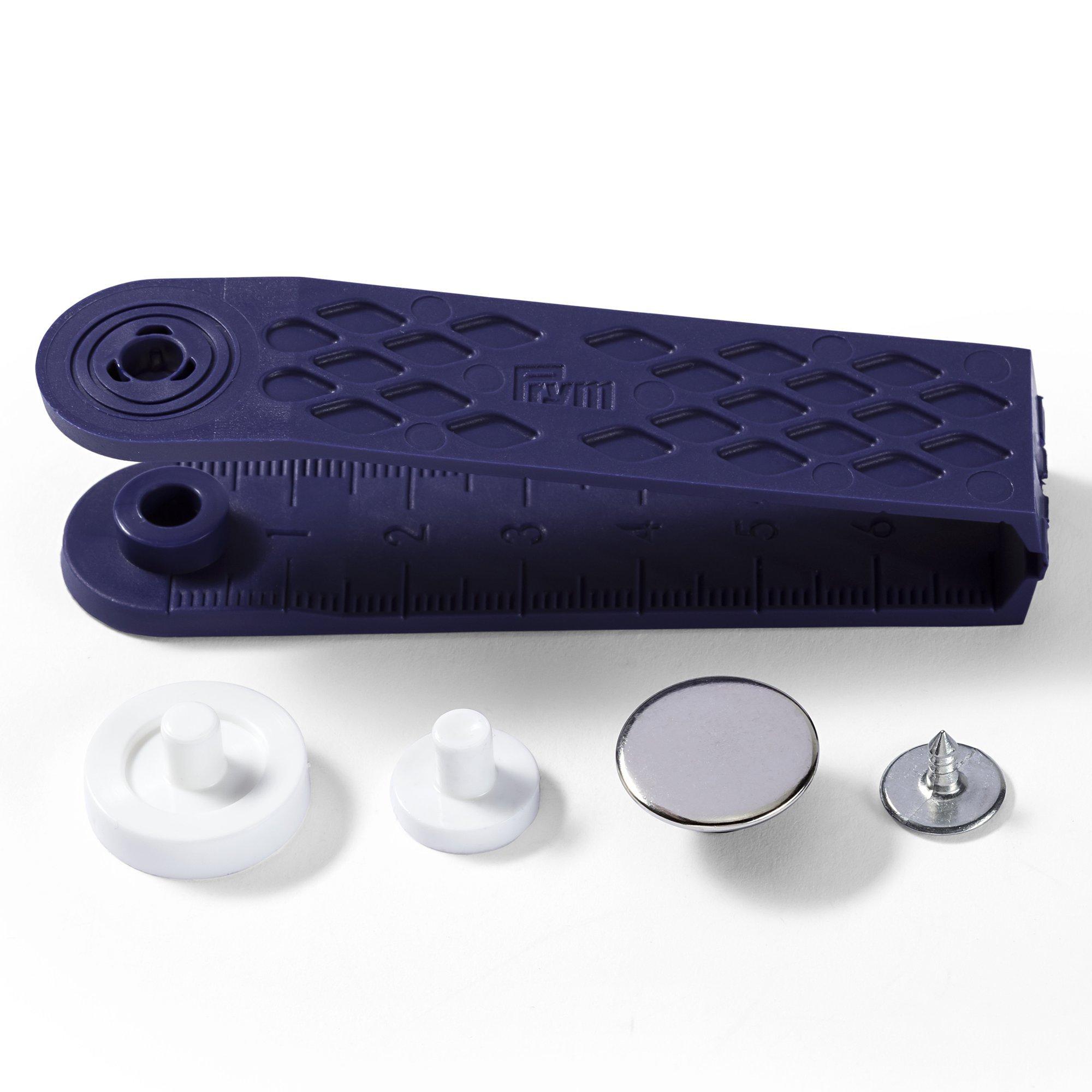 These silver coloured jeans buttons from Prym are 17mm in diameter and come in an a pack of 8. Brass, rustproof and of a plain design.
