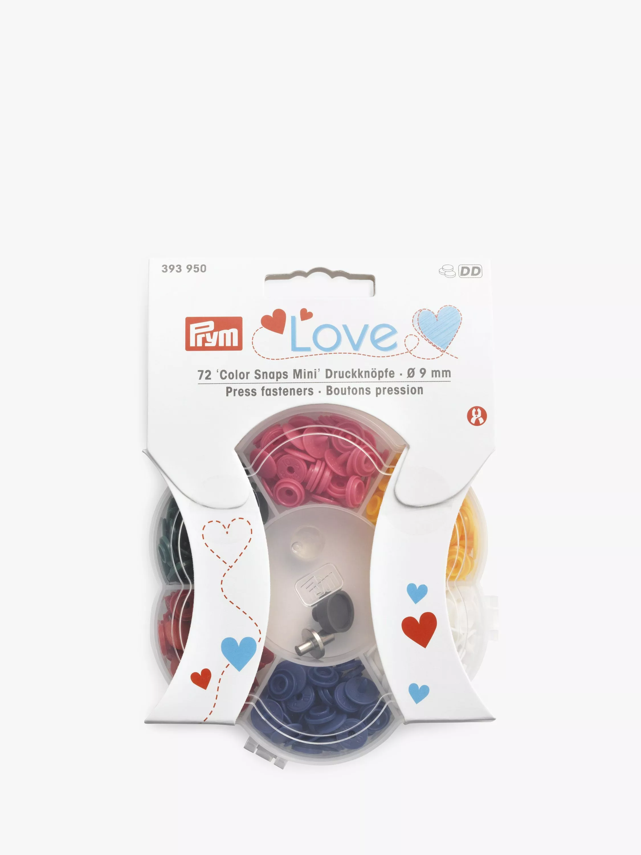 plastic box with colour-sorted, mini colour snaps that are Ideal for baby and children's garments. The only tools required are the VARIO pliers and the enclosed tool set.