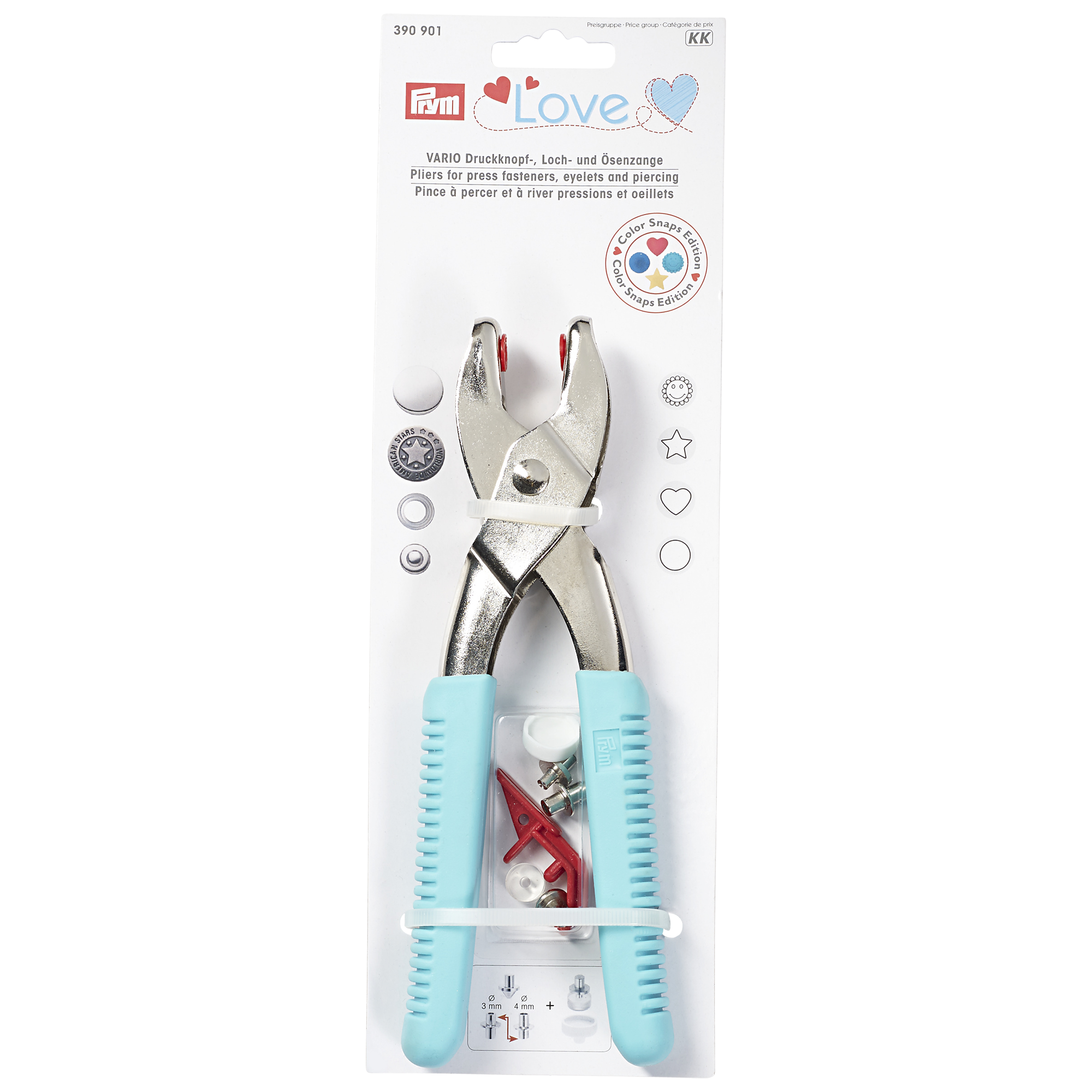 These vario pliers from Prym are perfect for riveting press fasteners, eyelets and jean buttons. It rivets with piercing tools for 3 and 4mm.