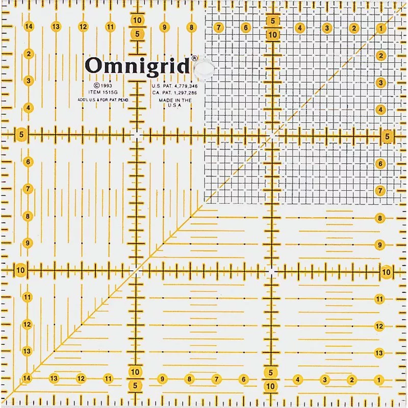 A universal patchwork ruler with cm scale (15x15cm grid) for use when making quilts.