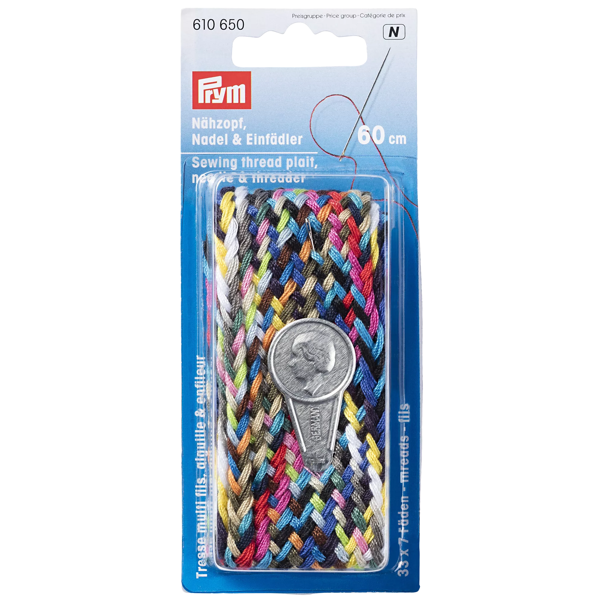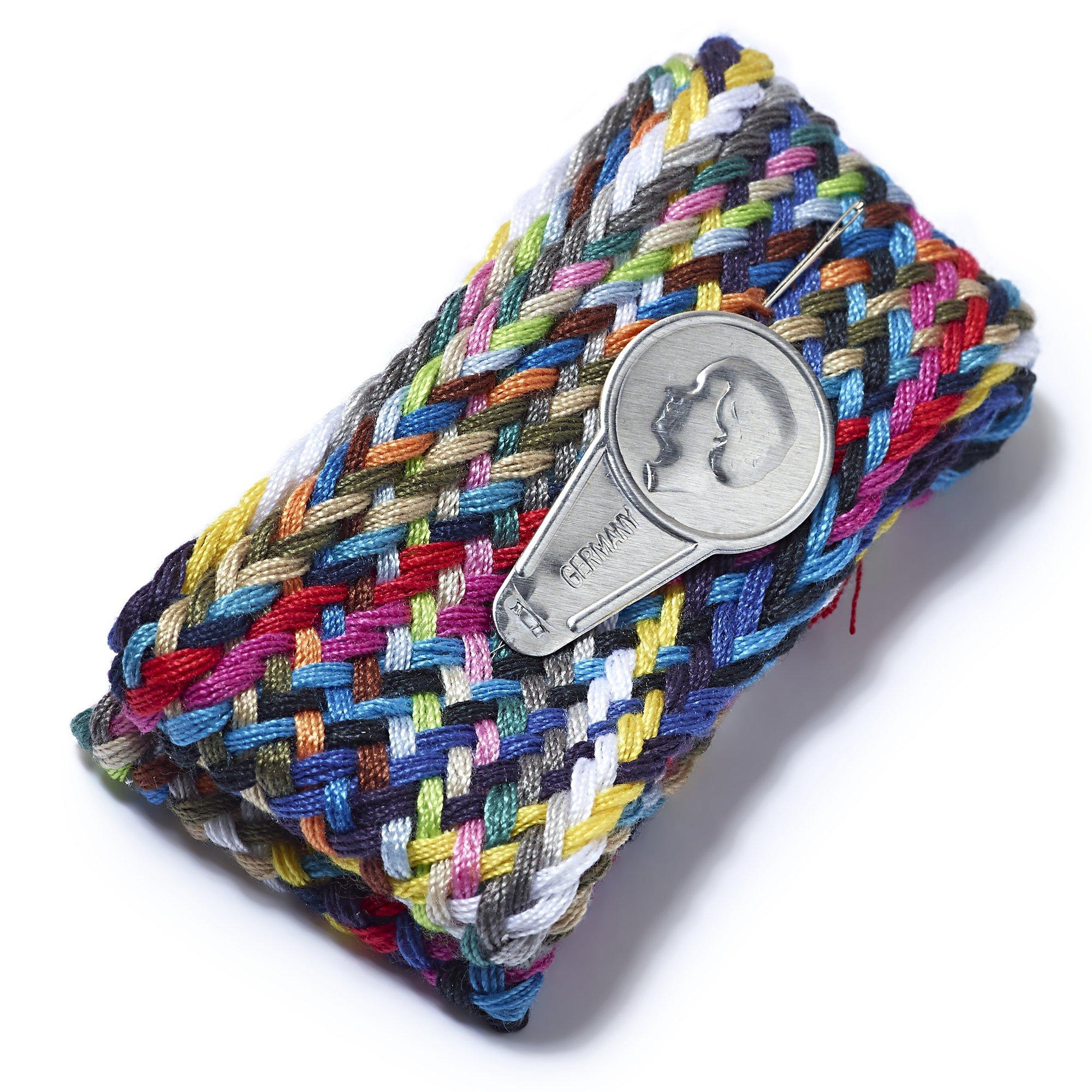 10 x 24 coloured threads in 60cm lengths, with a needle and a threader.
