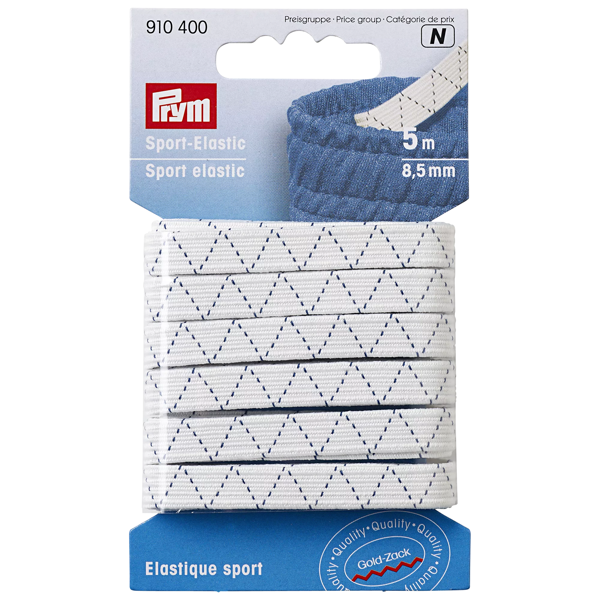 Gold-Zack sport elastic is ideal for replacing worn elastic in sports-wear such as jogging trousers and shorts. Size: 8.5mm x 5m.