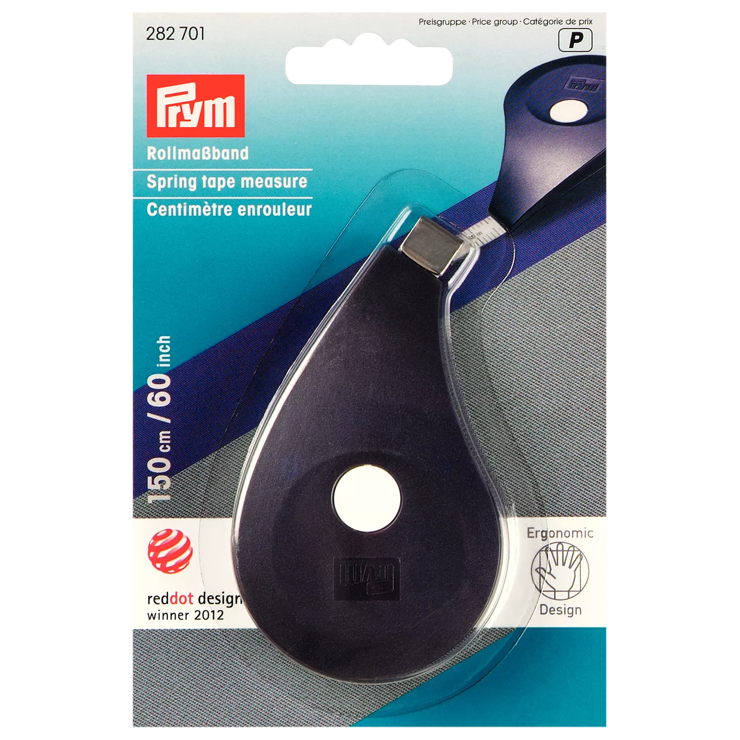 Spring tape measure with an ergonomic design and innovative casing that ensures that tape lies flat. Length: 150cm.