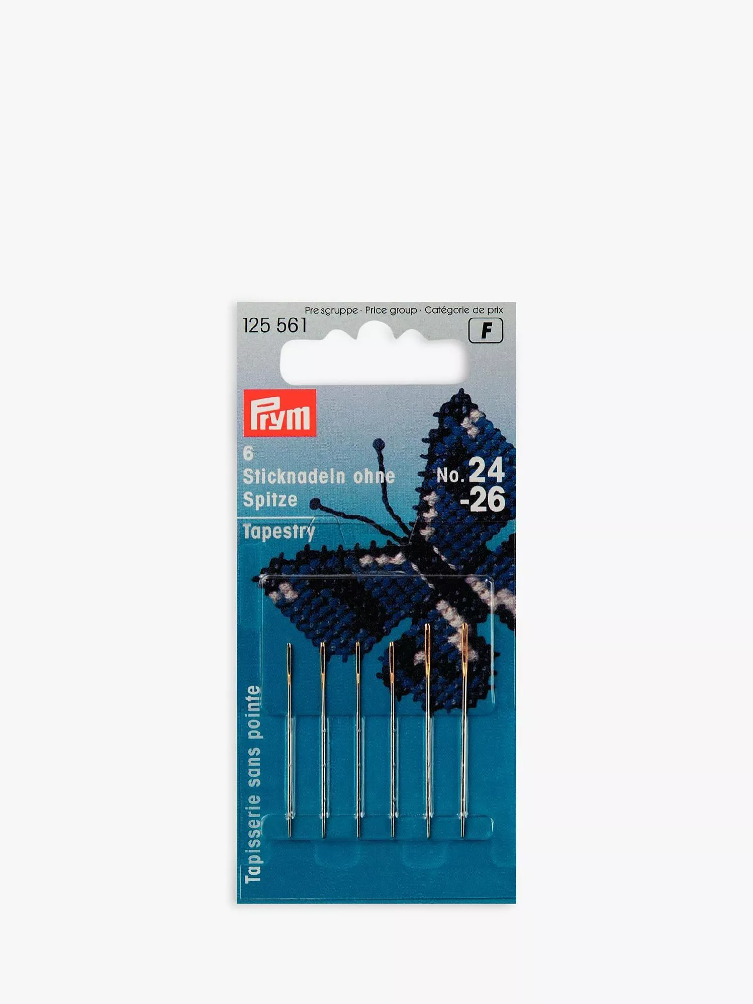 A pack of six tapestry needles with blunt points in sizes 24 to 26.