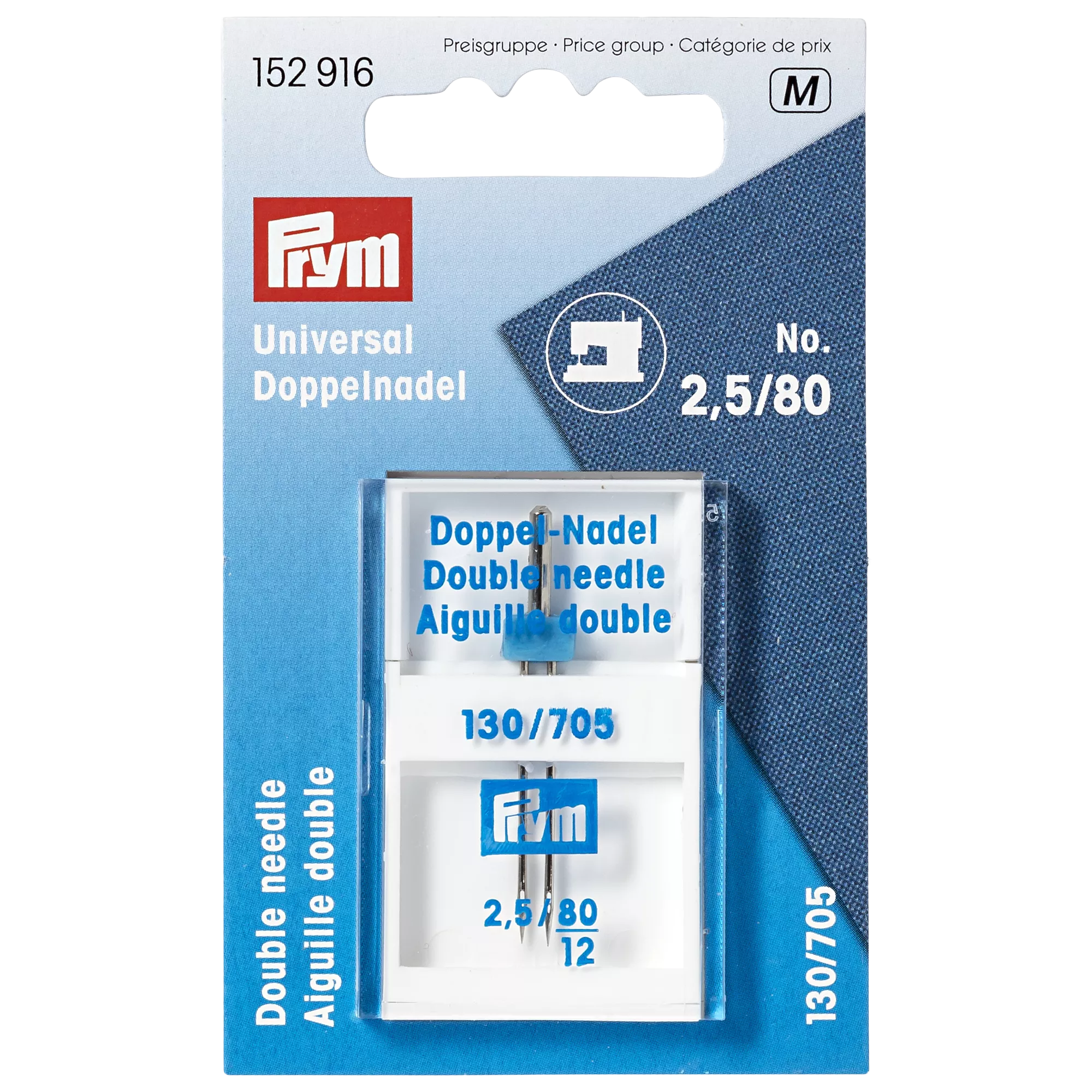 A universal sewing machine double needle with flat shank. Needle spacing: 2.5mm/size 80.