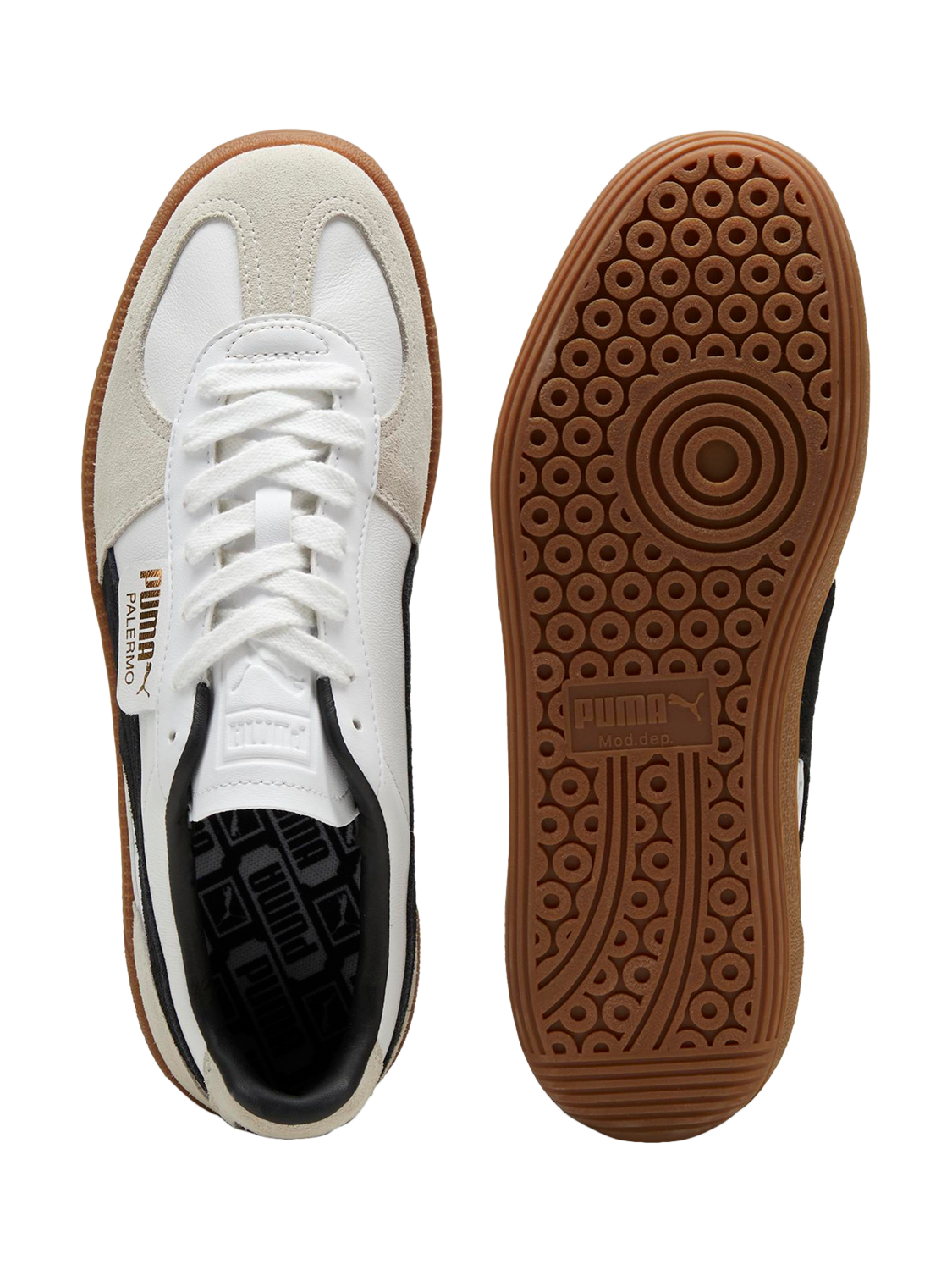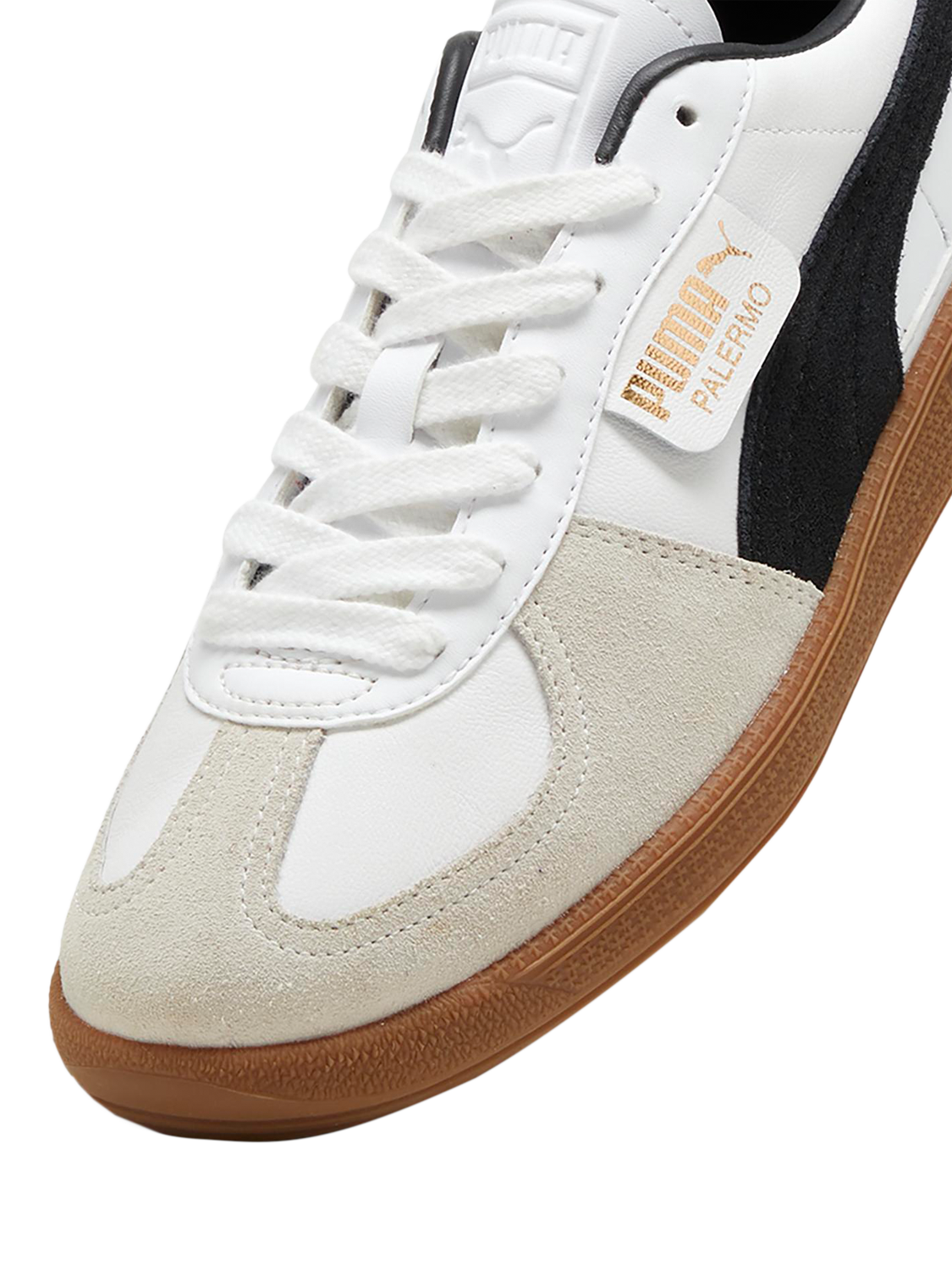 Straight from the archives, it's the PUMA Palermo. This classic terrace shoe is revived today with its signature T-toe construction plus extra-bold colour blocking and plush materials. Its design builds on PUMA's heritage within football while appealing to today's sneakerheads and terrace fashion mavens. This execution features a leather base with a suede formstrip and overlays.