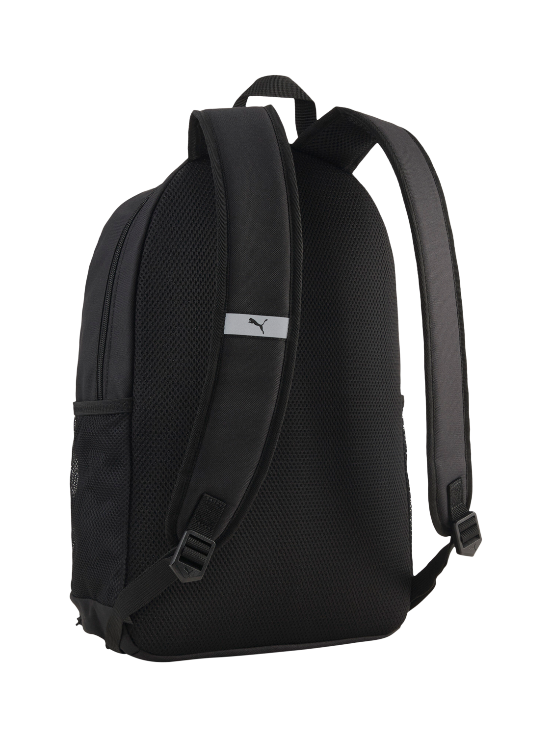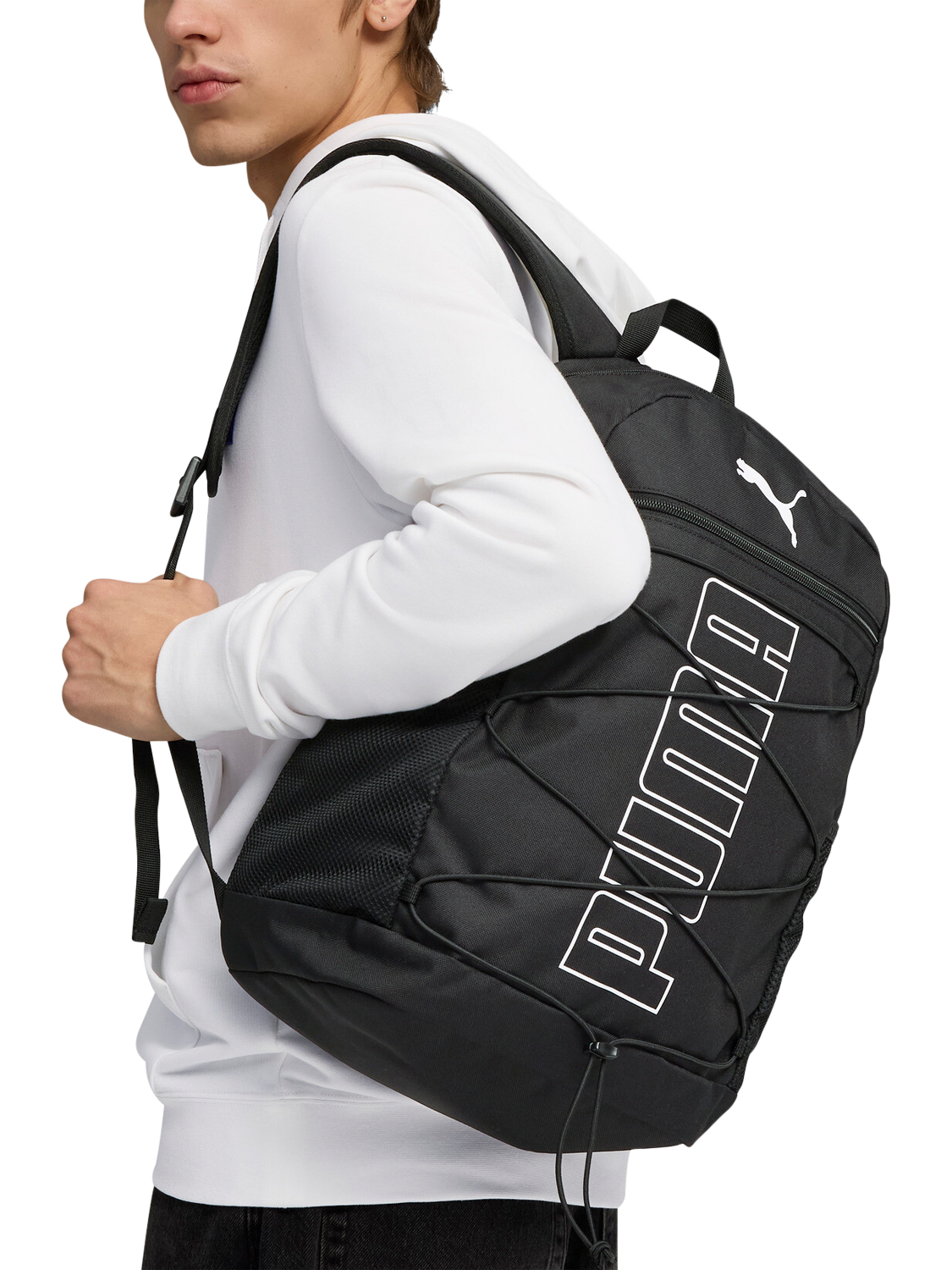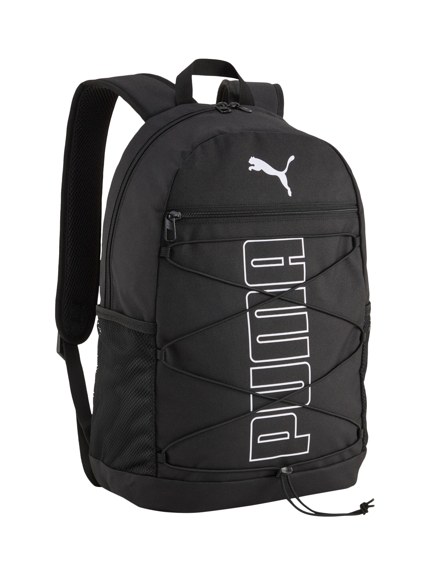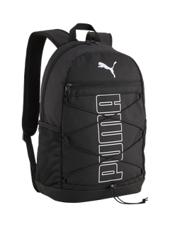 PUMA Plus Backpack blends sporty style with everyday function. Multiple compartments keep essentials organised, while two side pockets hold your water bottle and umbrella. Padded straps and back ensure comfort on the go. Details include a two-way zip opening into main compartment, zip front pocket, two side mesh pockets and lined sleeve.