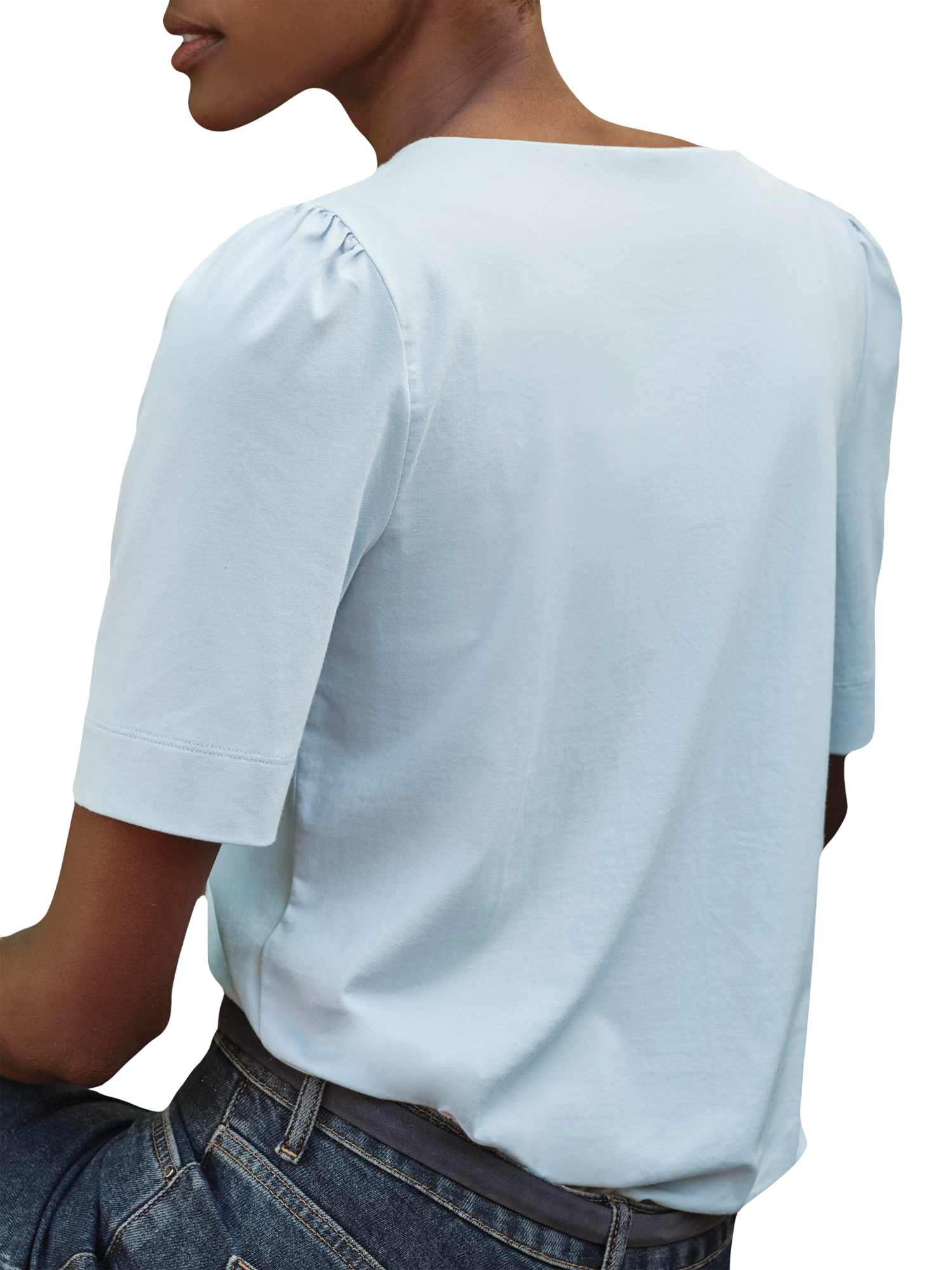 With soft ruffles and delicate pleating on the shoulder, this classic silhouette elevates any casual look and is easily dressed up for a special occasion. With half-length sleeves that work through the seasons. Made from organic cotton with a touch of elastane for added comfort.