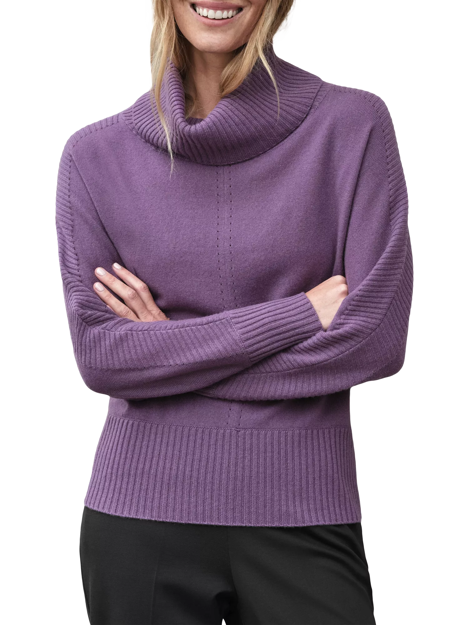 Contemporary and comfortable dolman sleeves add refined elegance to this relaxed and cosy shape, with a cowl neck that makes a stylish statement. Tall ribbed cuffs and hem put it a cut above the rest, and there's ribbing along the sleeves for a final touch of style. Crafted from 100% super soft cashmere.
