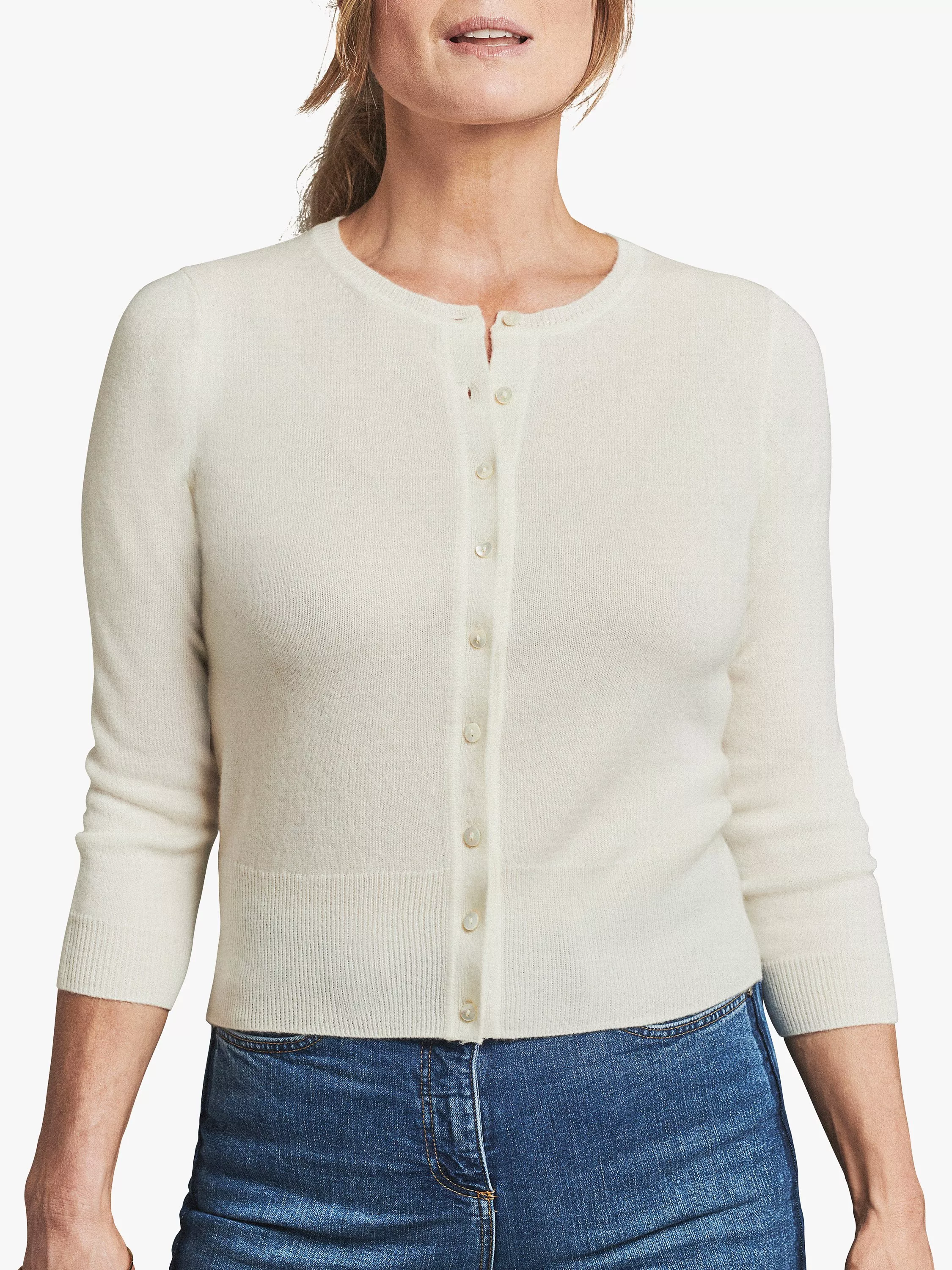 Crafted from signature cashmere, this Pure Collection cropped fitted cardigan has stylish smoked shell button details and makes an elegant addition to your everyday ensemble.