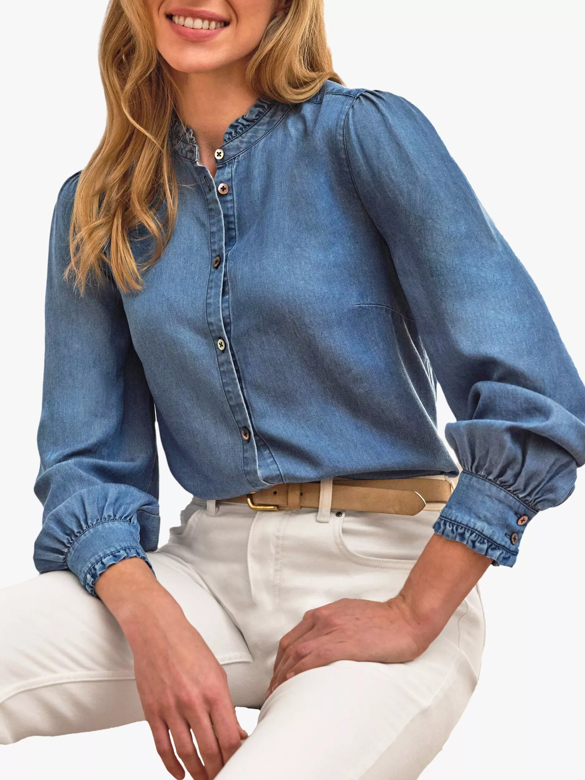 A romantic feel with the timeless style of the look of denim, this shirt is made from light and soft tencel. With subtle frills on the cuffs and collar, with puffs to the sleeves, for a flattering and sweetly prim shape. Perfect for lunch with friends or off duty days at home.