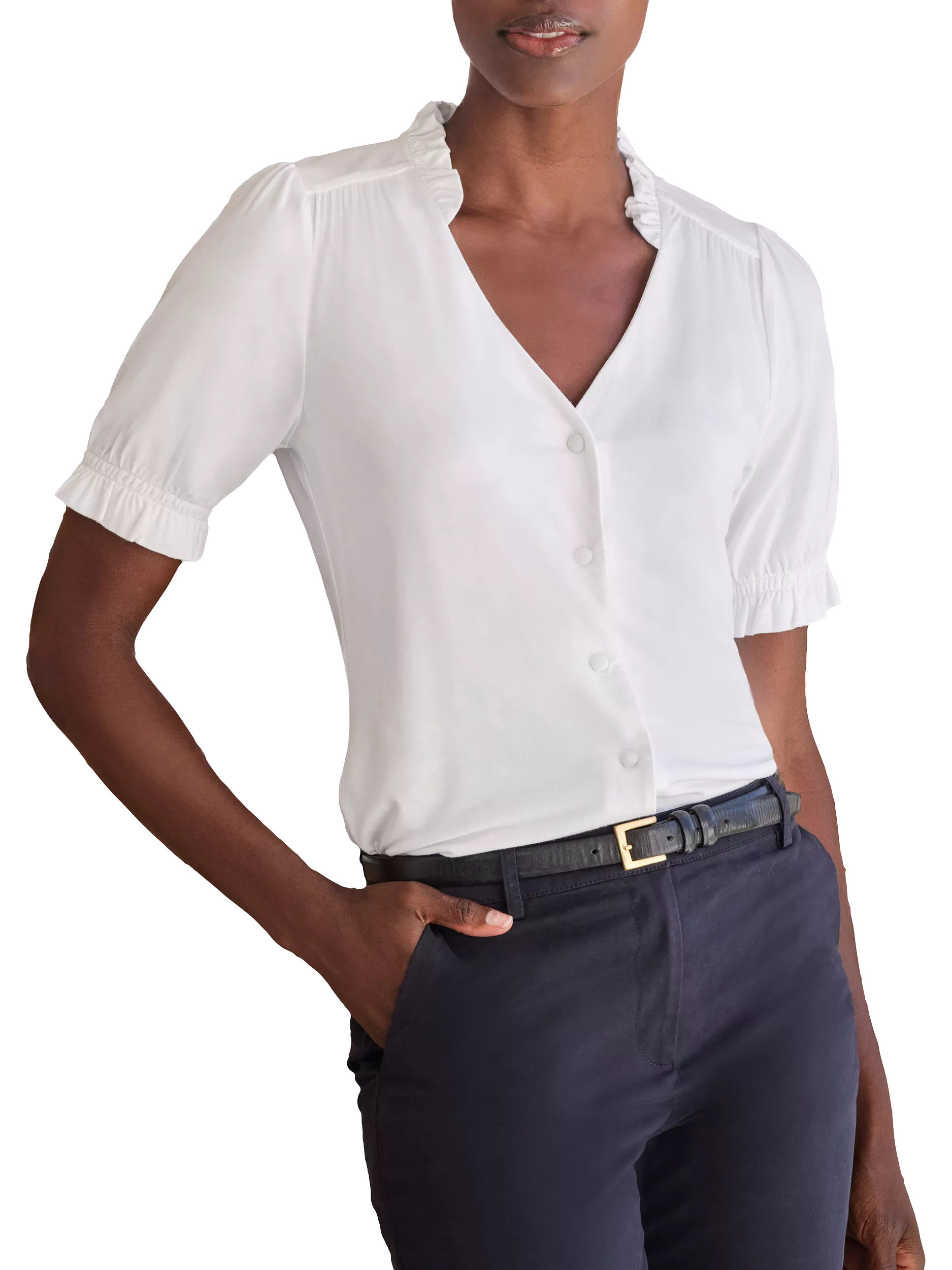 Refresh your everyday style with this soft jersey blouse, crafted from a comfortable modal blend. Featuring delicate frill detailing on the short sleeves and a flattering V-neckline, it adds a touch of feminine charm to any outfit. Designed for a true to size fit, it's an effortlessly chic choice for both casual and smart-casual looks.
