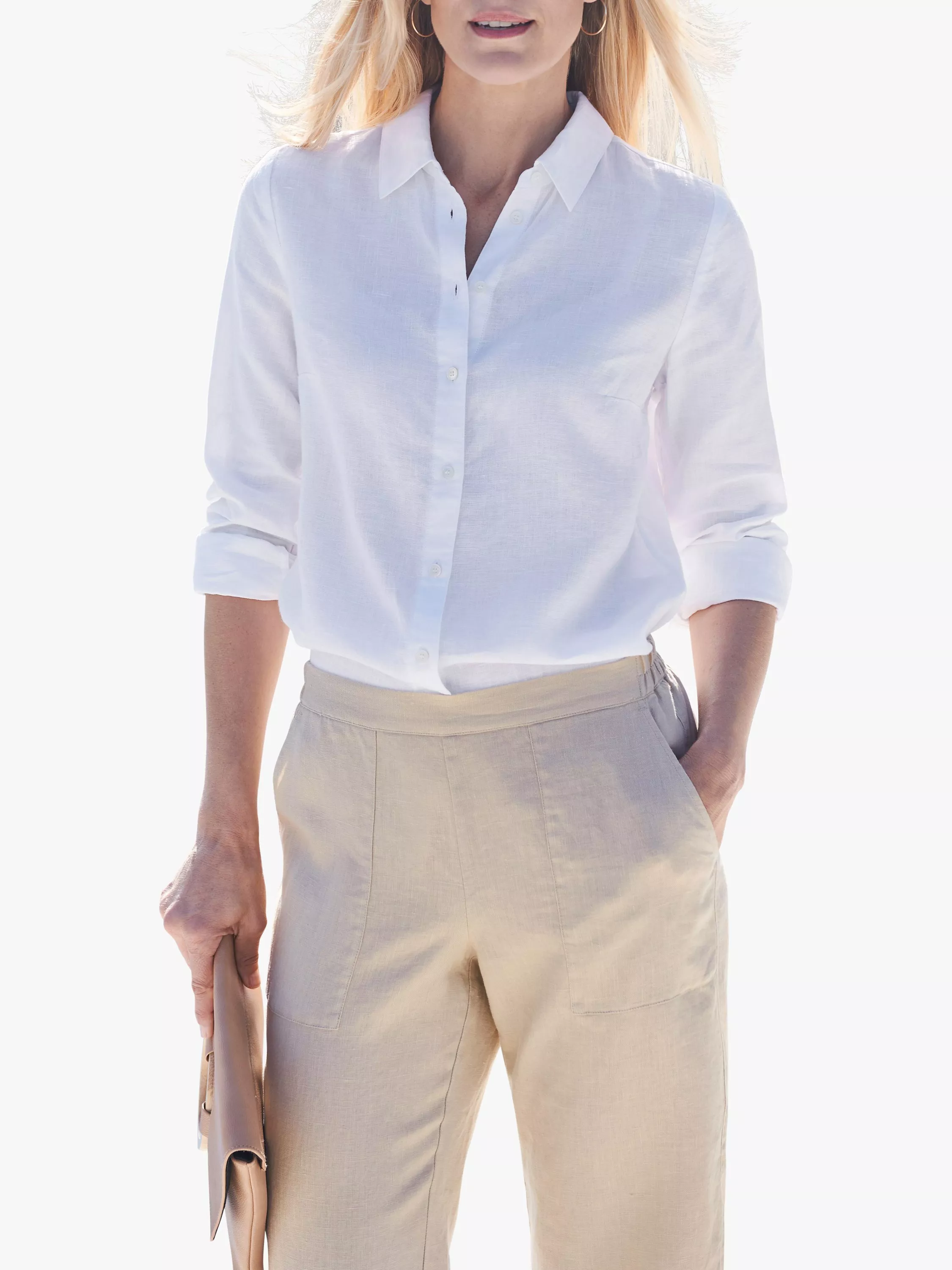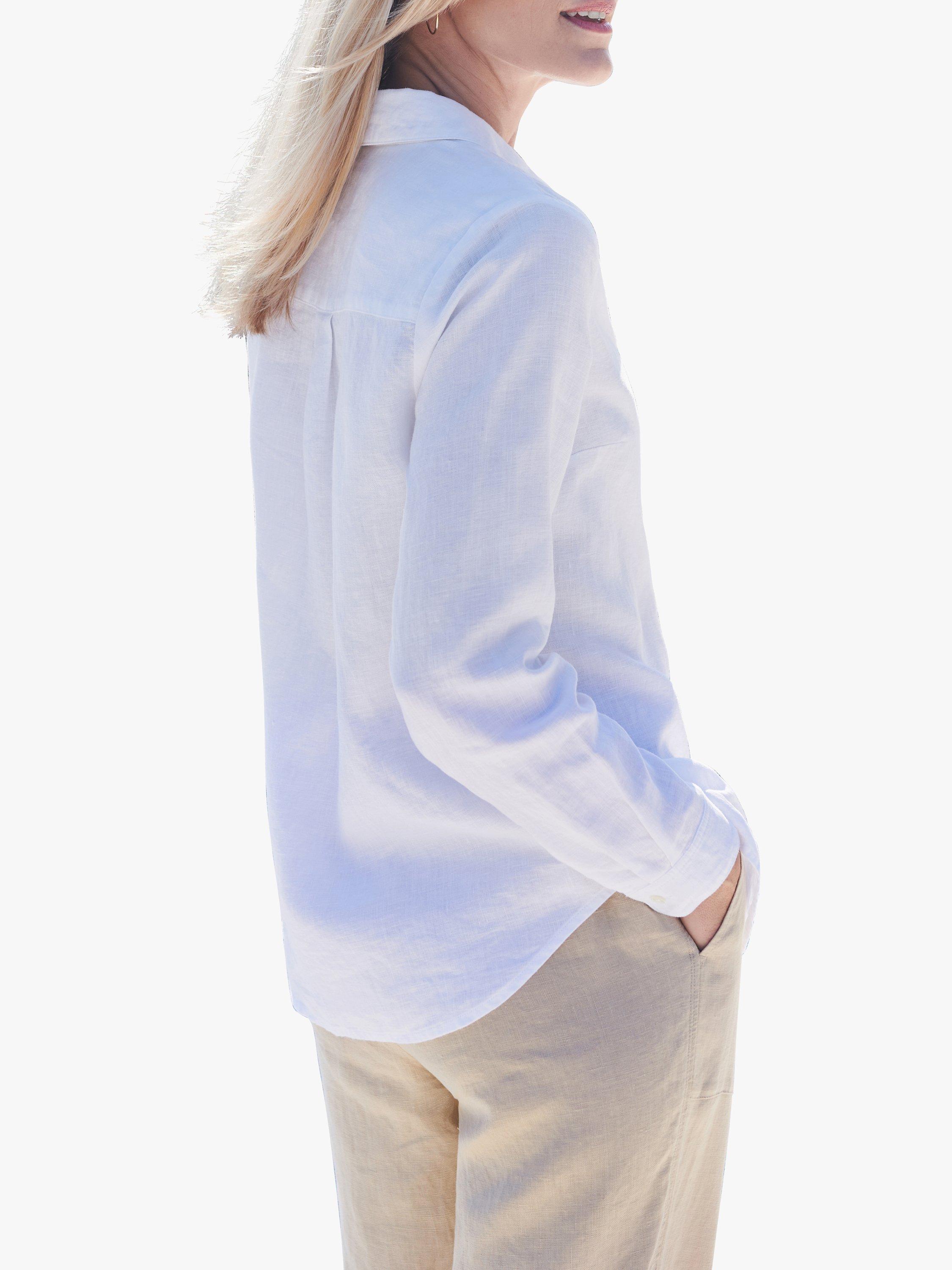 With a neat collared neck and long sleeves, it is made from pure linen, offering breathable comfort and slips on well with tonal denim ready for the summer.