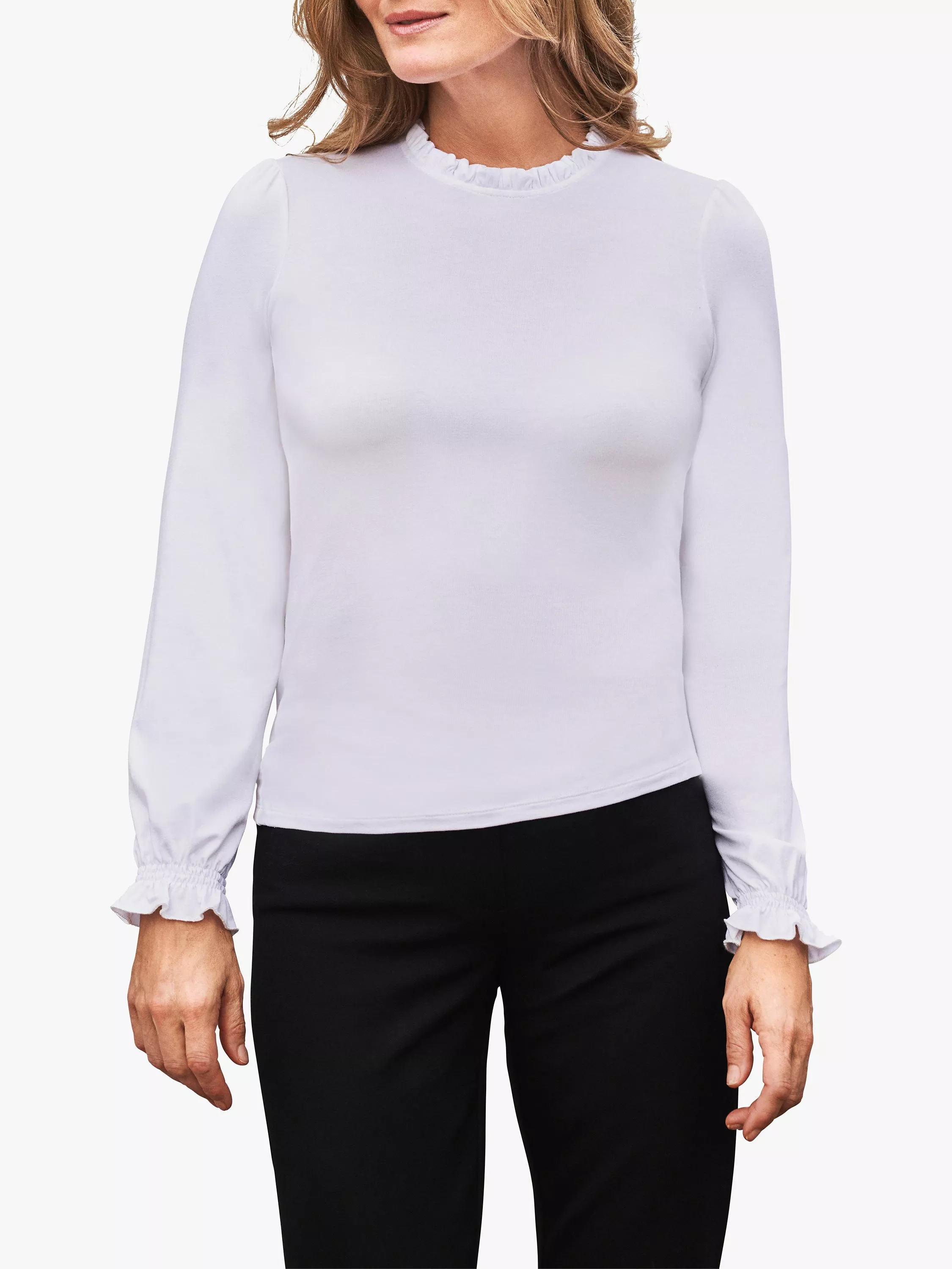 Made from a premium super-soft jersey for optimum comfort, this ruffle neck top from Pure Collection is ideal on its own or as a lovely light layer piece all year round. This wardrobe staple in a slim fit design has beautiful cuff detailing that we just love.