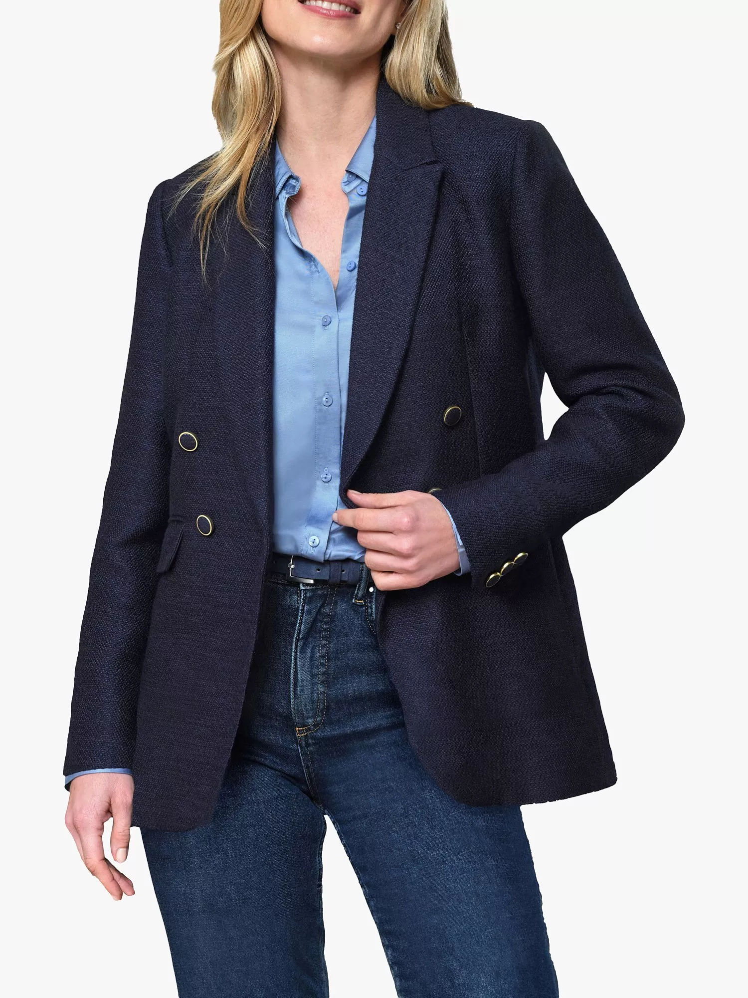 Go from work to weekends to special occasions in smart and luxurious style. Lapels and smart tailoring frame your figure, why not style with a silk shirt or cashmere crew. In a classic double breasted cut, the brand's added gold rimmed buttons on the sleeves to match the front.