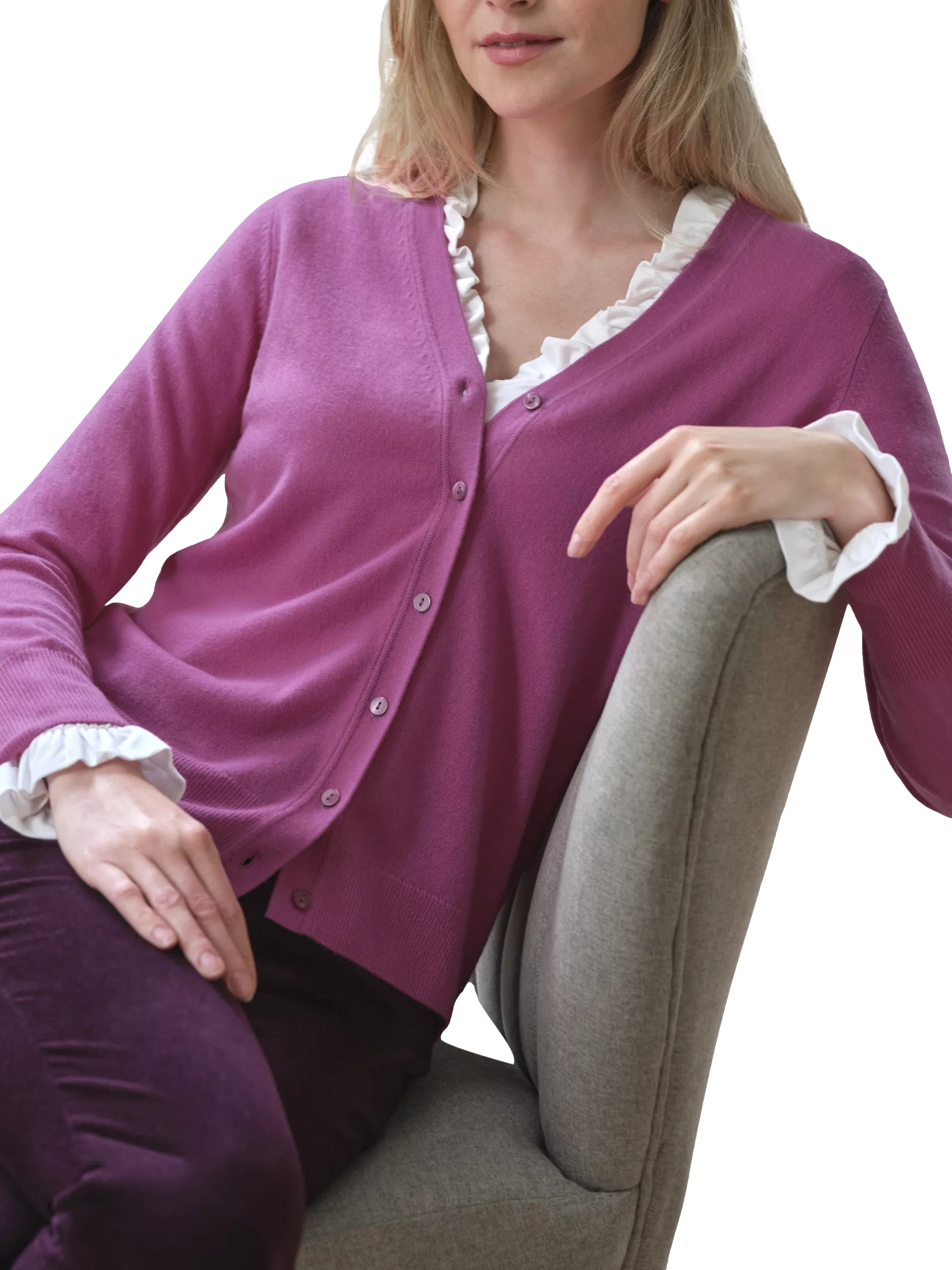 Our cashmere cardigan is a firm favourite. With a flattering v neck and classic fitted shape. With mother of pearl button fastening and its machine washable - perfect for when you're in a hurry.