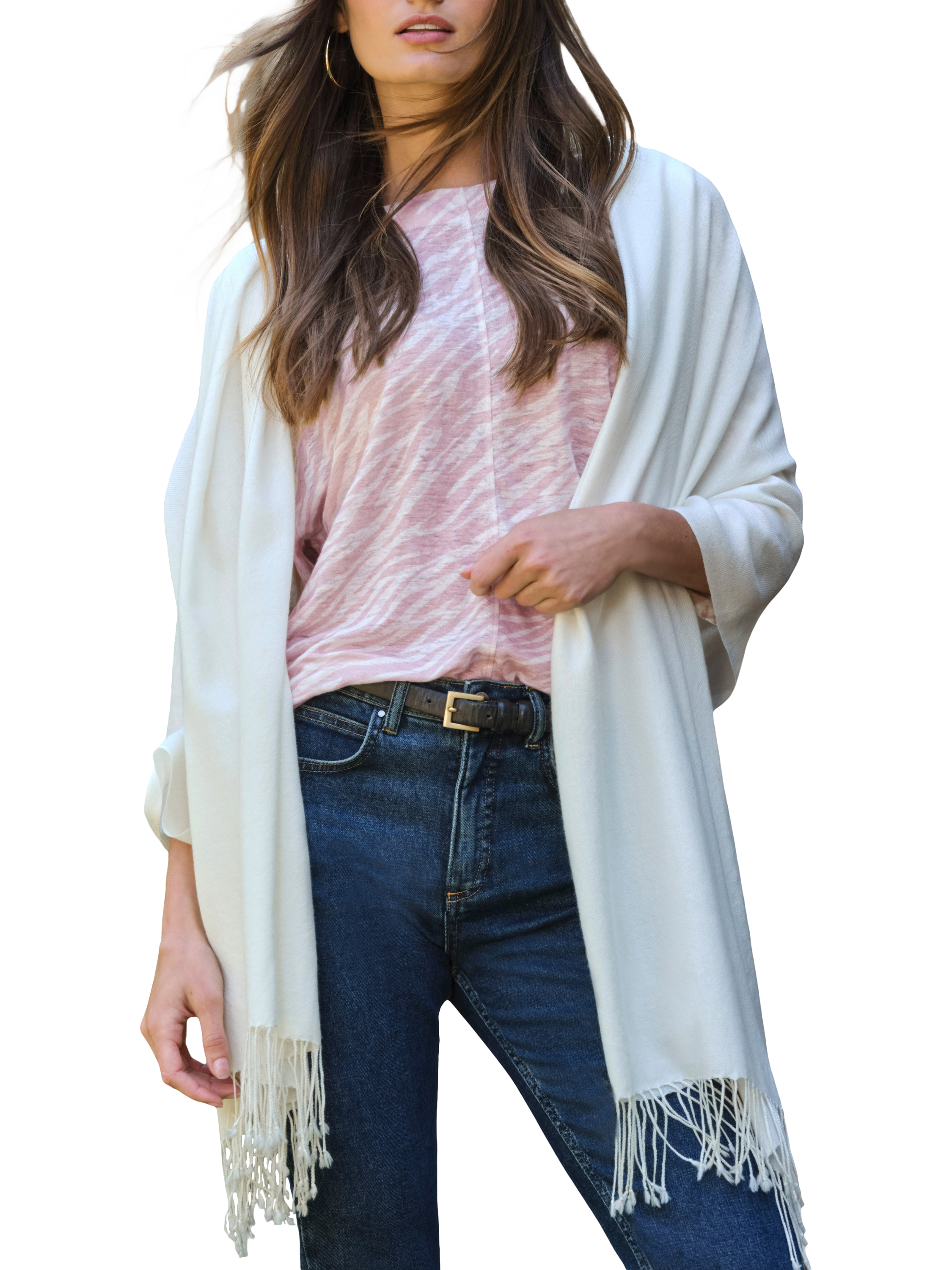 The Super Soft Pashmina is an essential layering piece. Made from a luxuriously soft cashmere merino blend, this pashmina is both light and warm, making it a versatile choice for all seasons.