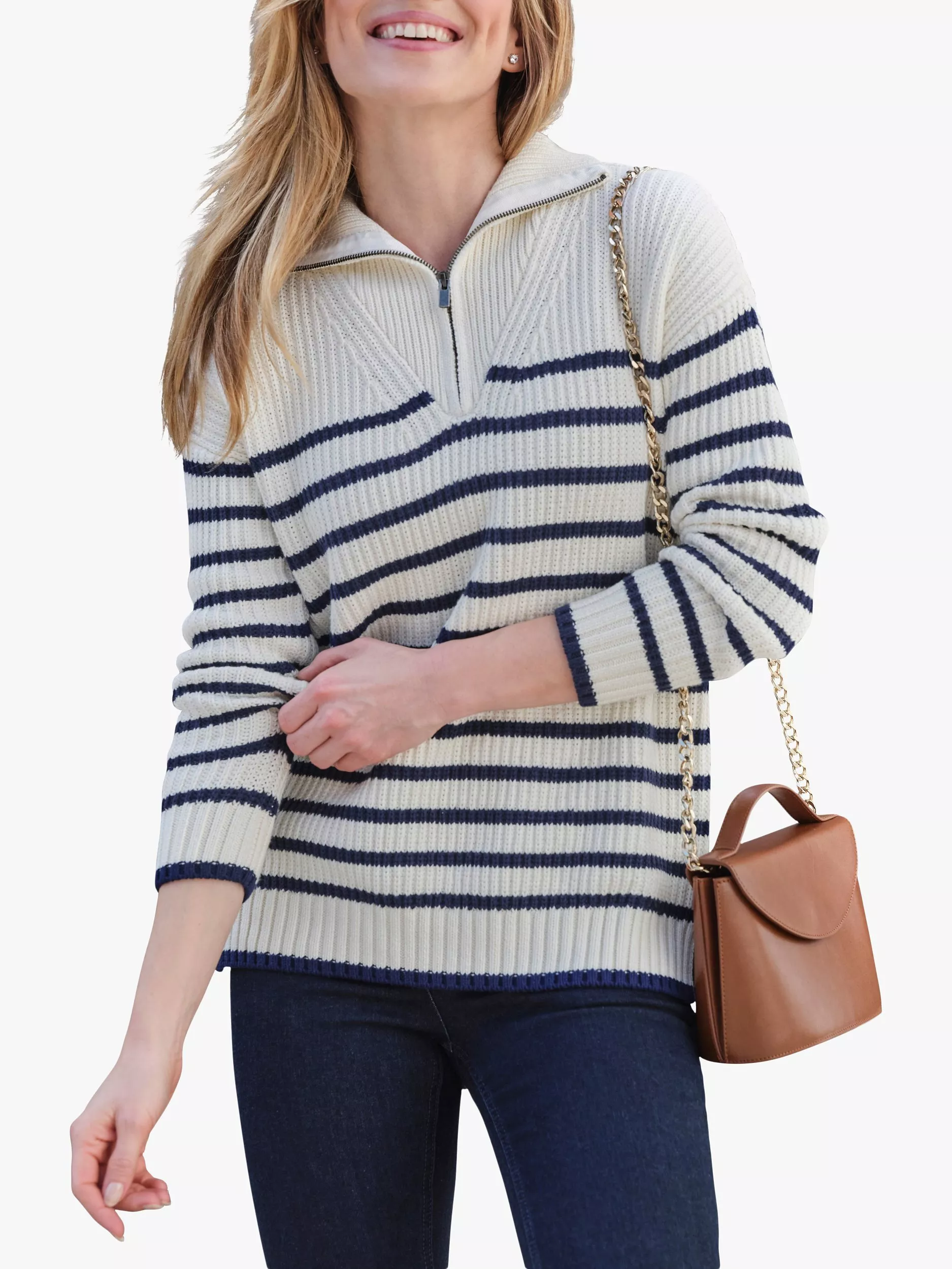 Pure CollectionZip Neck Stripe Jumper, Ivory/Navy