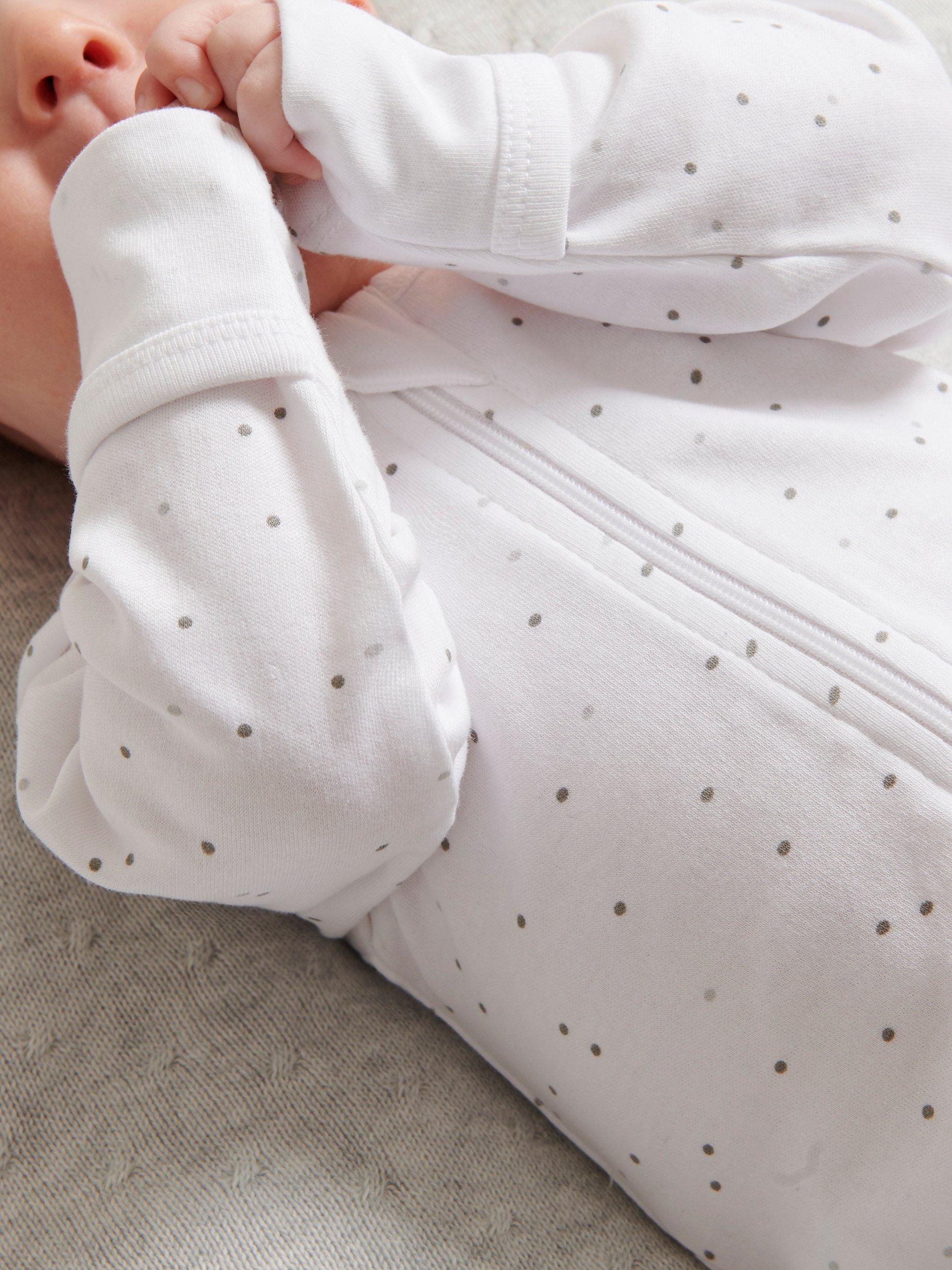 In a pack of two, these grow suits have been made from organic cotton for a finish that's kind against sensitive skin. They feature full-length double zips with safety folds for quick and easy dressing plus optional turn-over mittens to ensure baby is kept covered and warm.