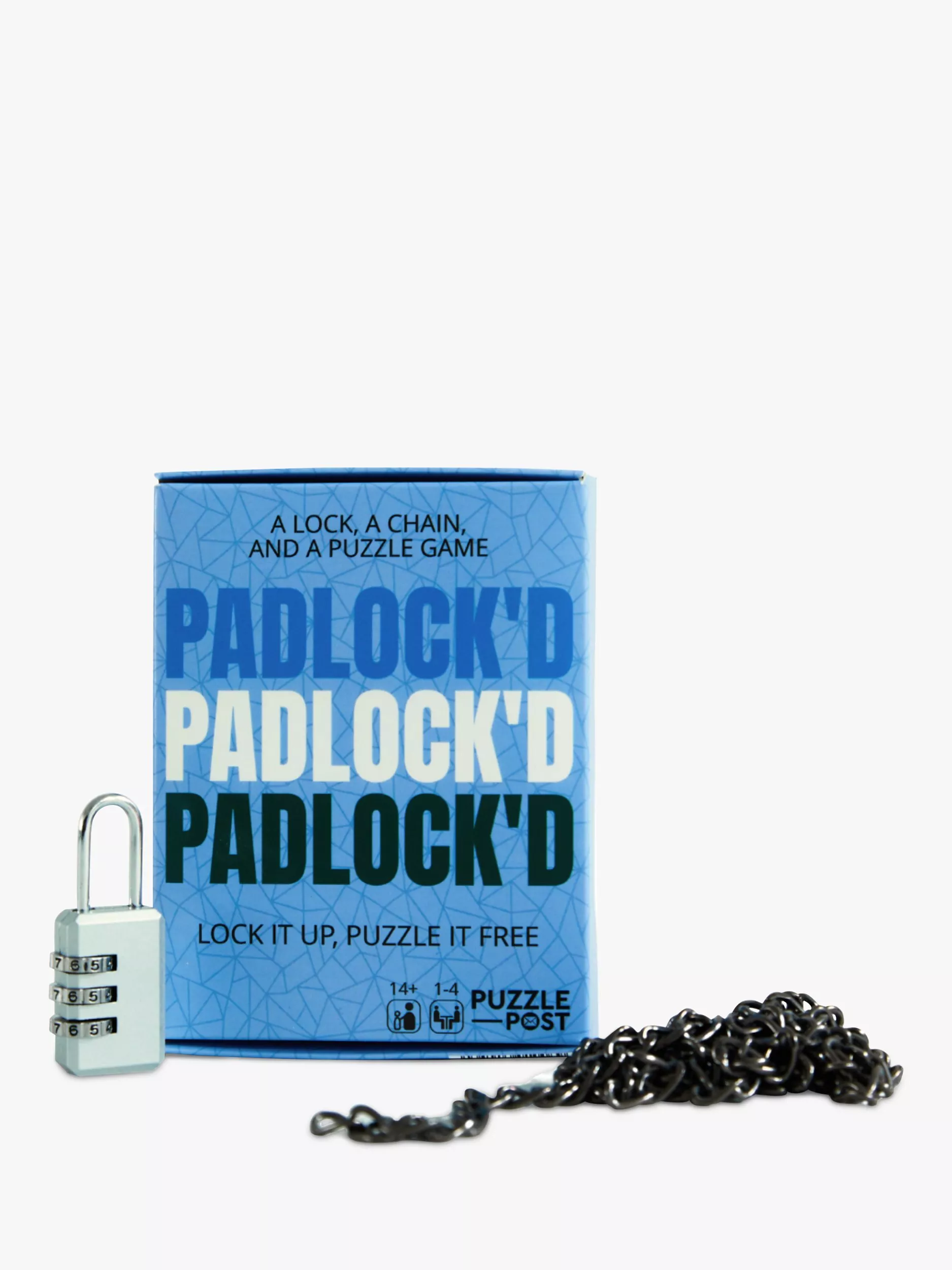 Contains: 1.4 metre chain, padlock, envelope full of puzzles, instruction card.