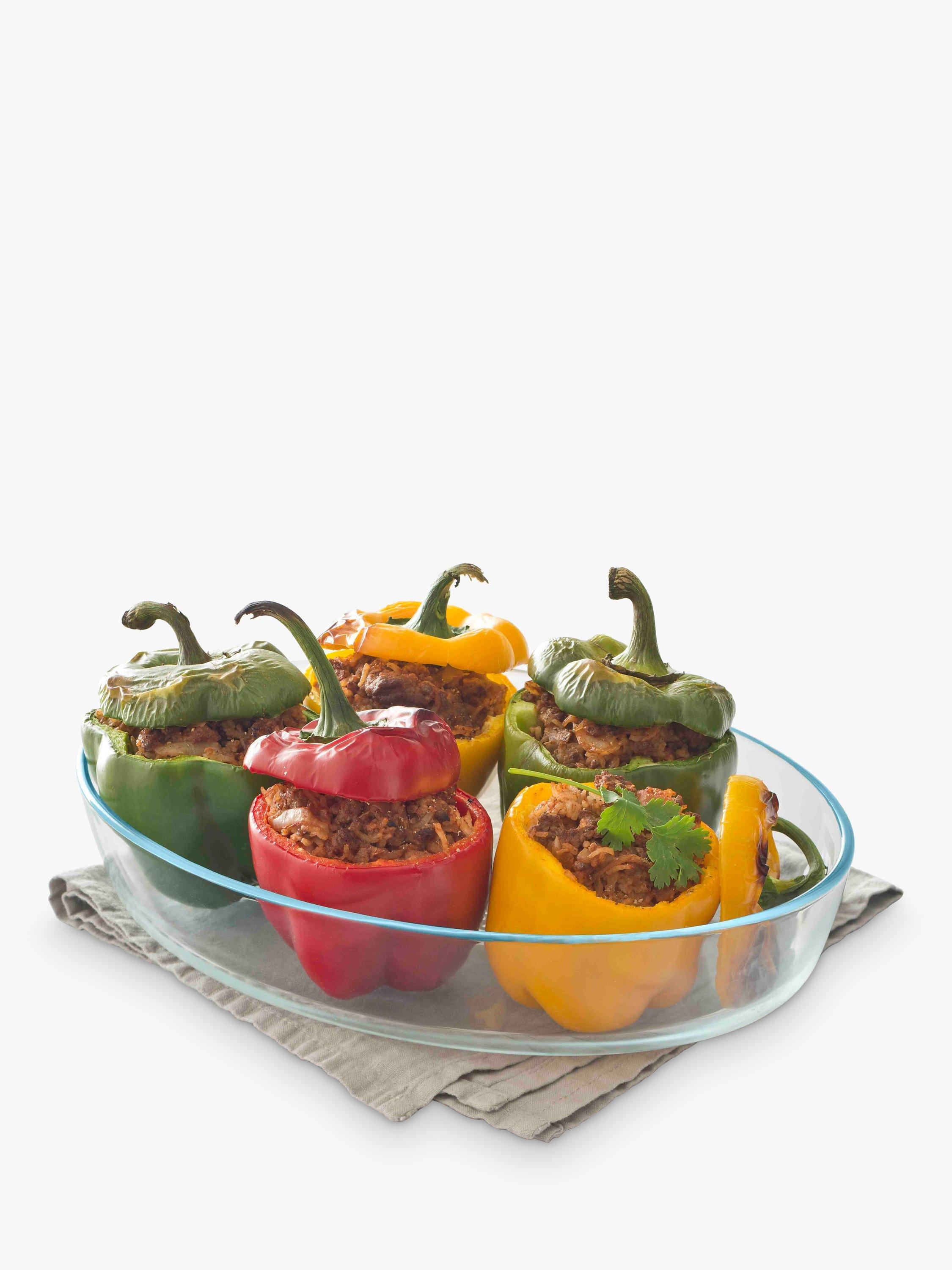 A Pyrex® Essentials oval dish for roasting and oven-cooking sweet and savoury food up to 300°C.