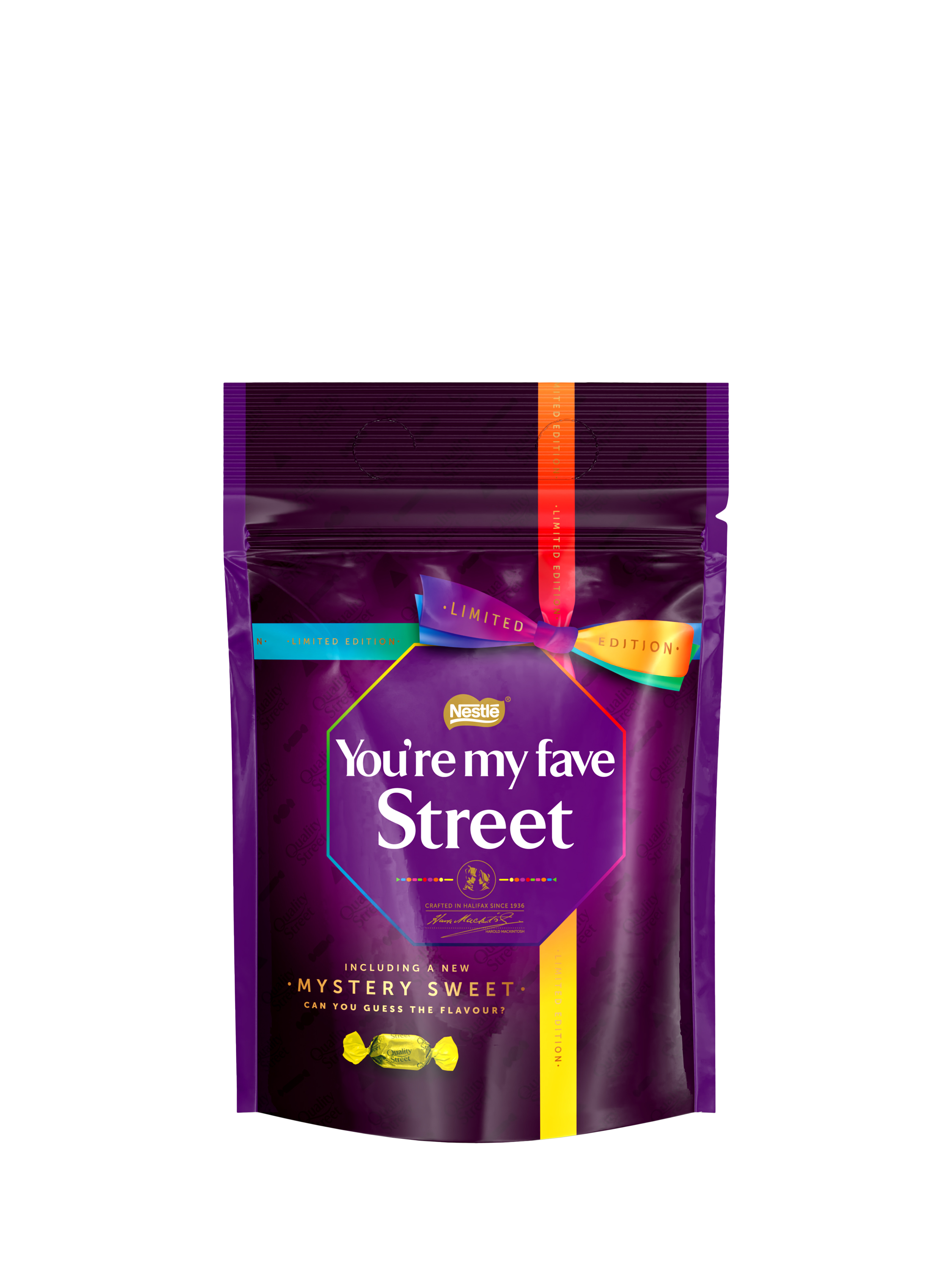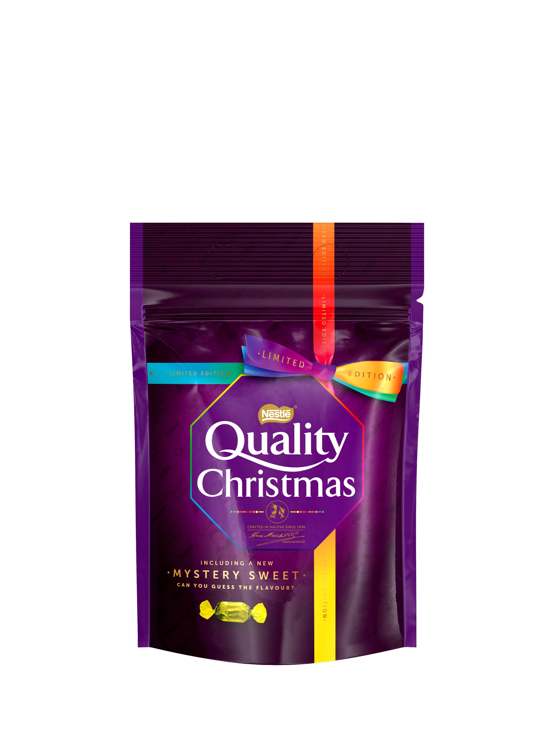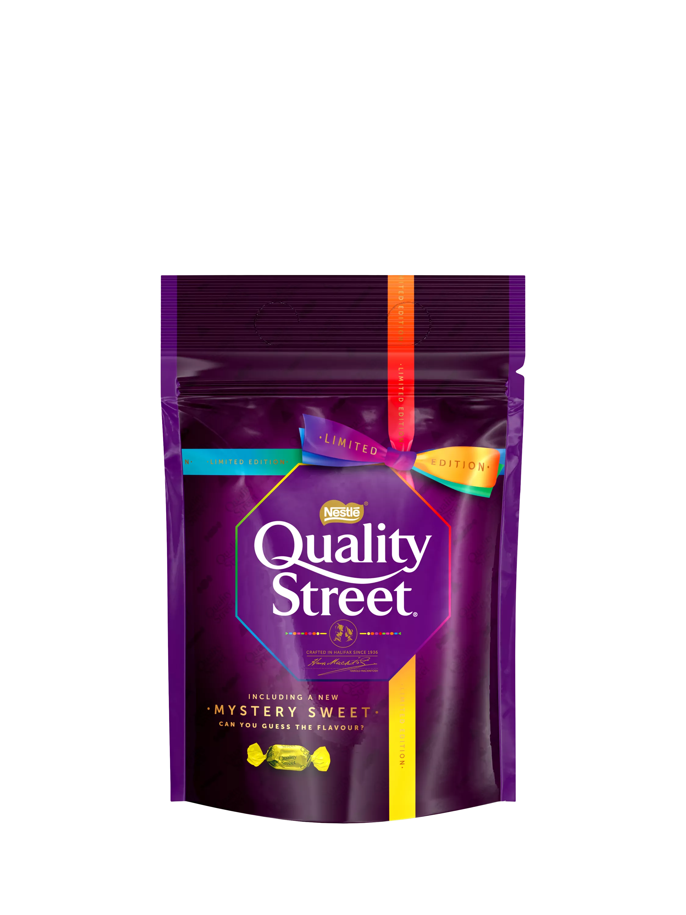 Quality Street sharing pouch filled with the iconic individually wrapped milk and dark chocolates, toffees and fruit cremes. Exclusive, limited edition front of pack design, perfect for sharing at festive celebrations - includes an exclusive Mystery Sweet.