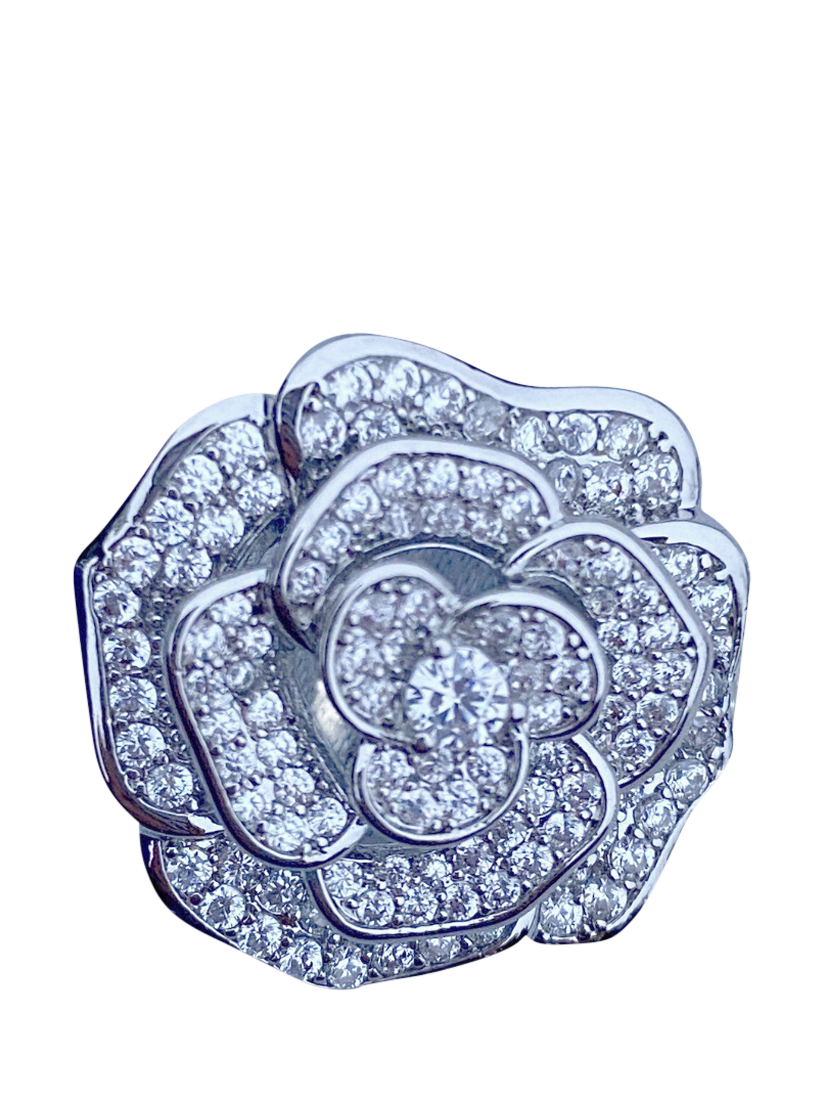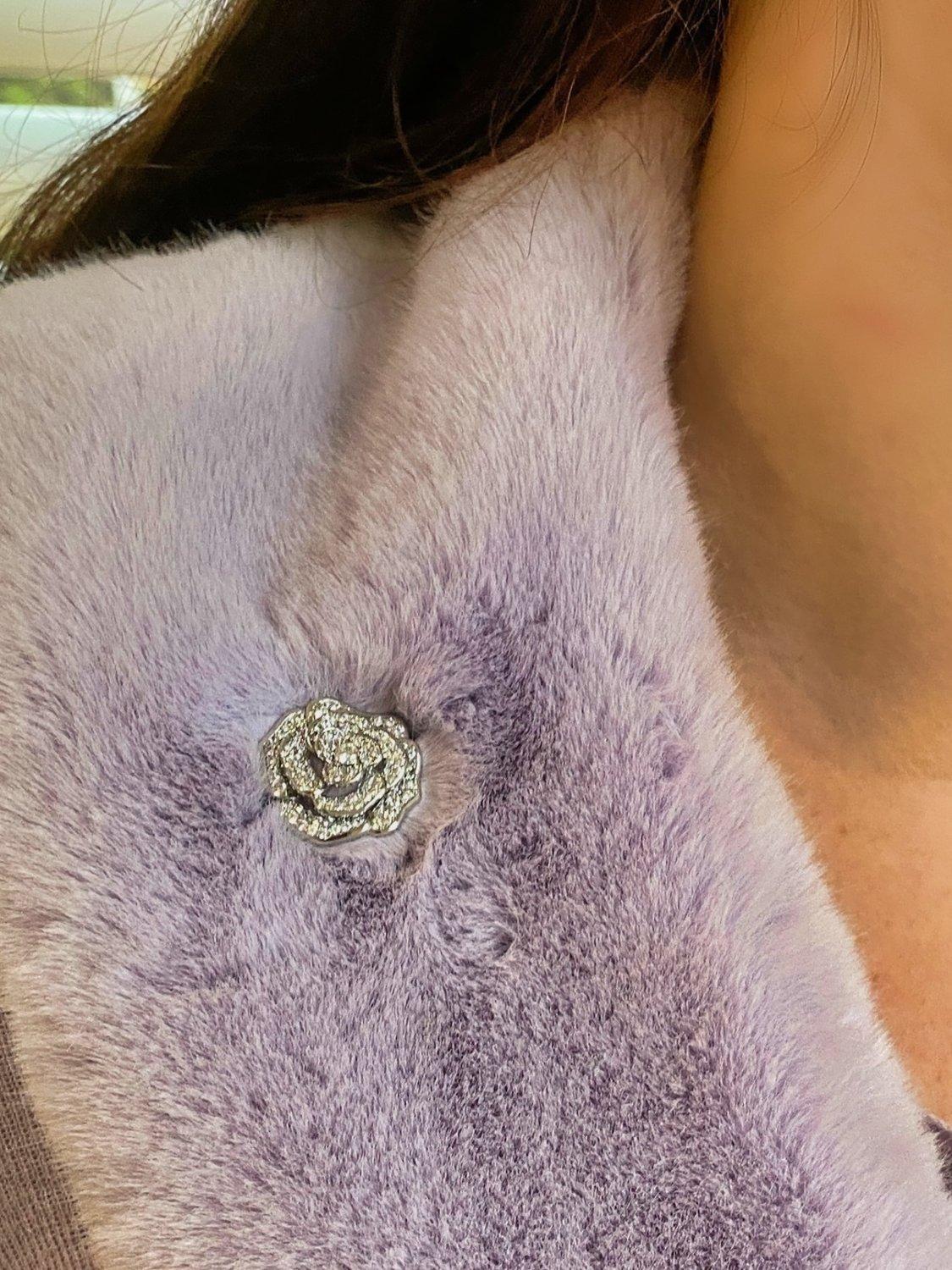This delicate rose brooch is beautifully chic - with its trim and gently sparkling diamante.