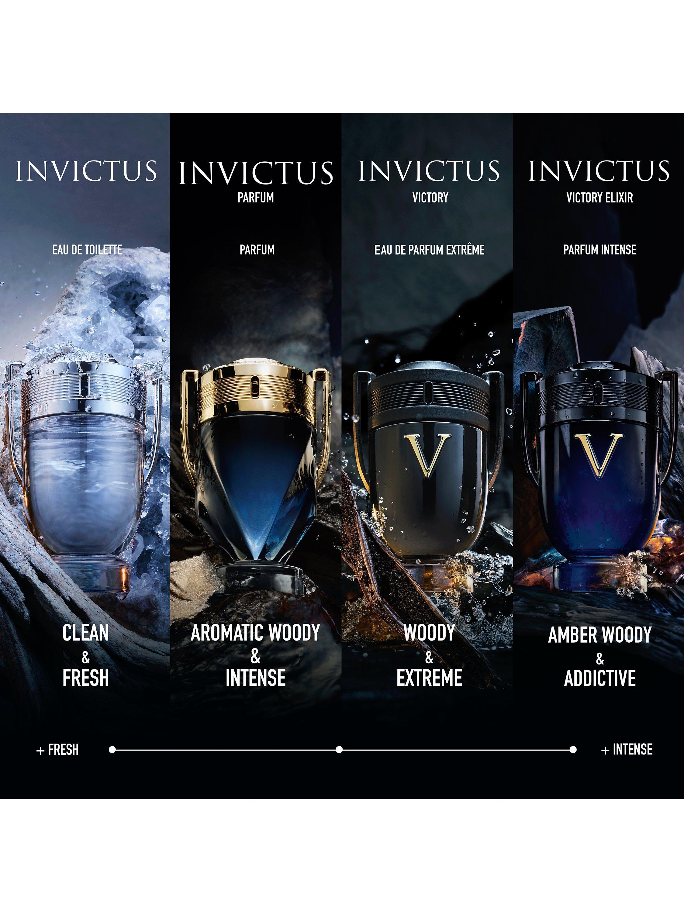 The fragrance: The quintessence of Invictus Victory. A precious ambery woody and spicy elixir blending high-impact. Leading to high-performance, highly concentrated ingredients for maximum intensity. The addictive scent of victory.