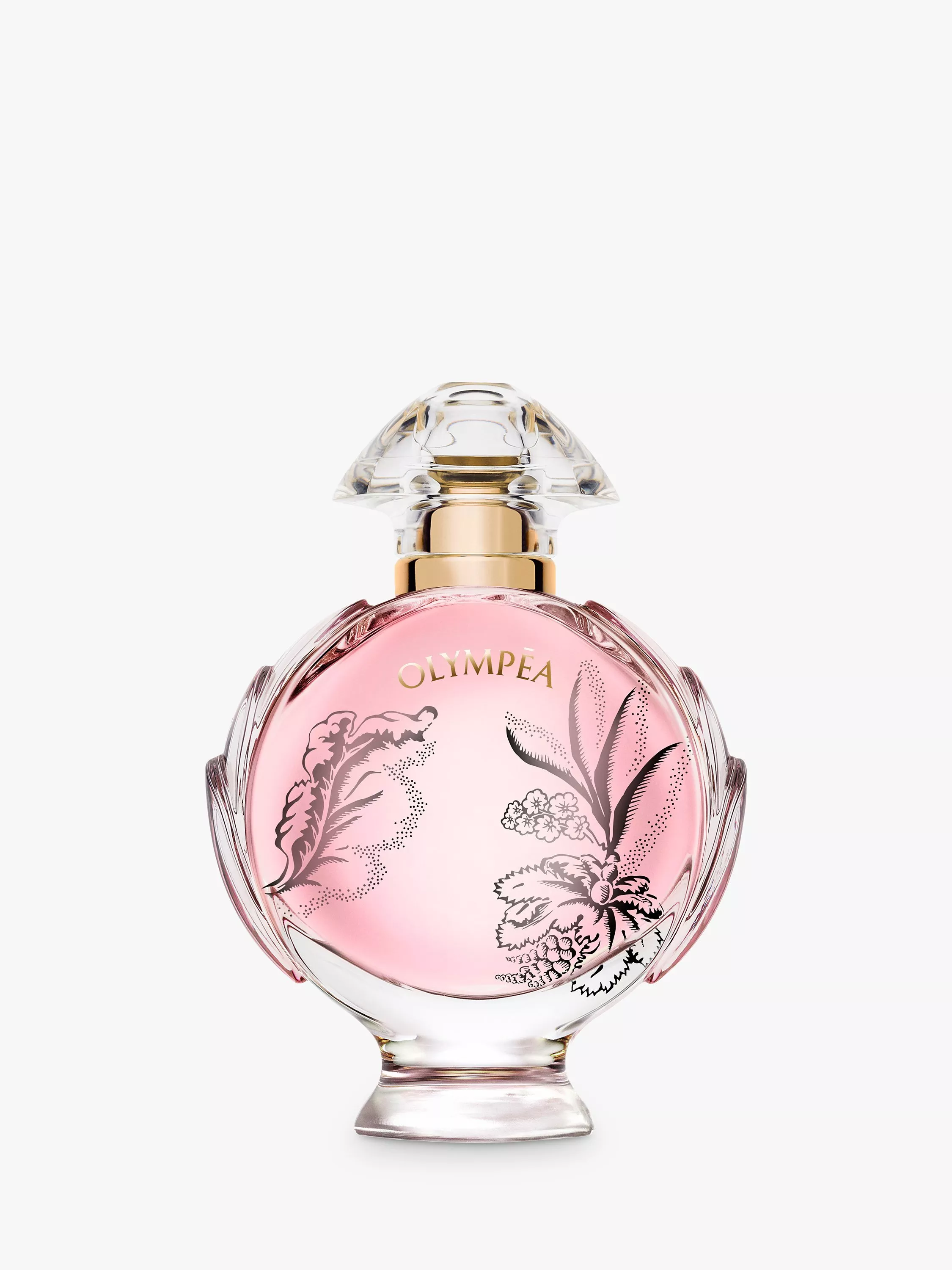 The bottle: Olympéa Blossom, a glass bottle encompassed by a soft pink hue. A bouquet of graphic black flowers, inspired by Rabanne's styling, blossoms across the bottle. For exceptional shine, the lid features luminous gold contrasting with deep black.