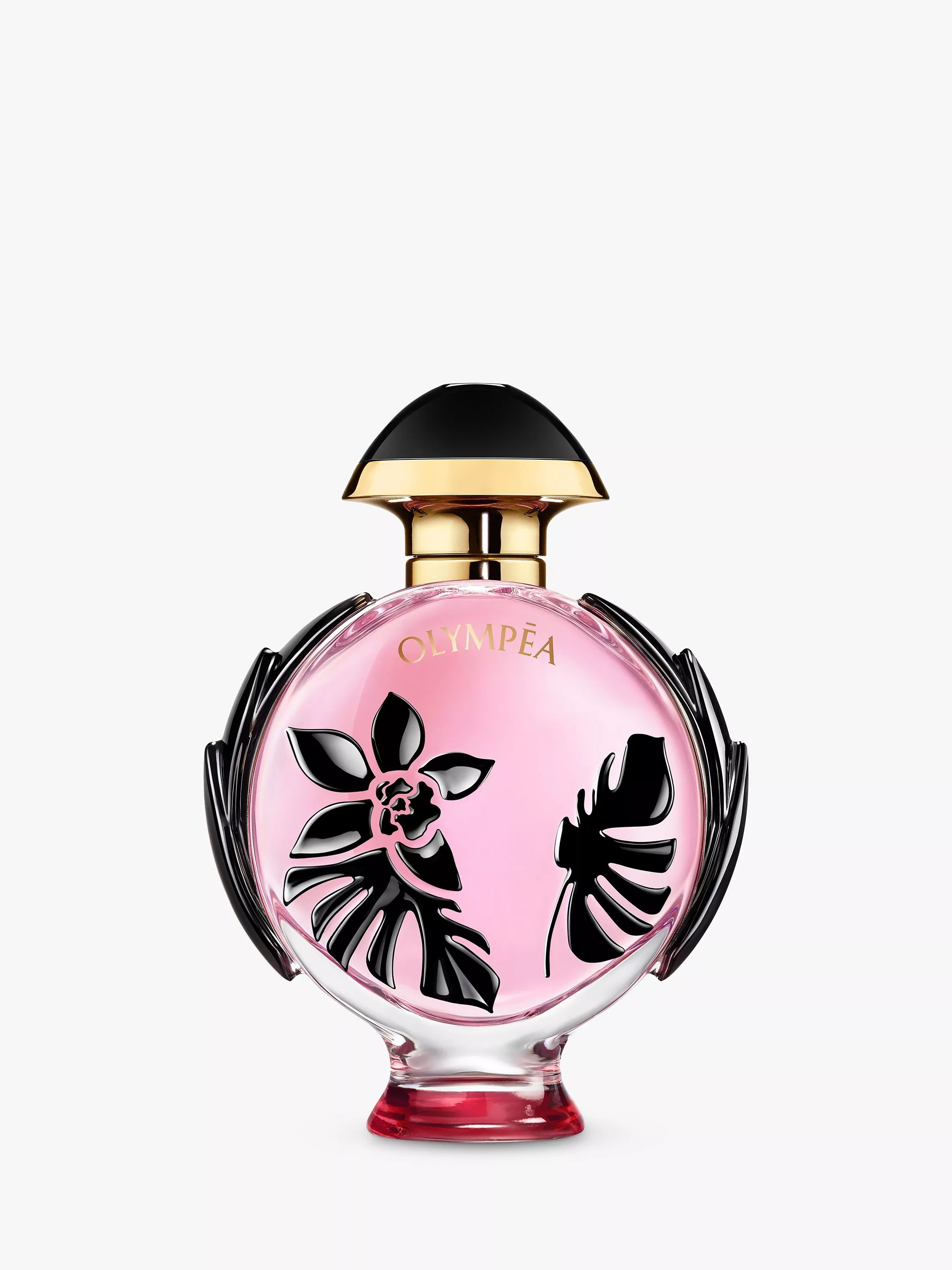 Olympéa Flora, the intense Eau de Parfum for women by Rabanne. Capturing today's glamourous goddess who knows all about the power of flowers. The pop pink bouquet matches a thorny rose with a fresh-petaled peony, juxtaposing two facets of Olympéa's femininity: dangerous flowers blooming pink and black.
