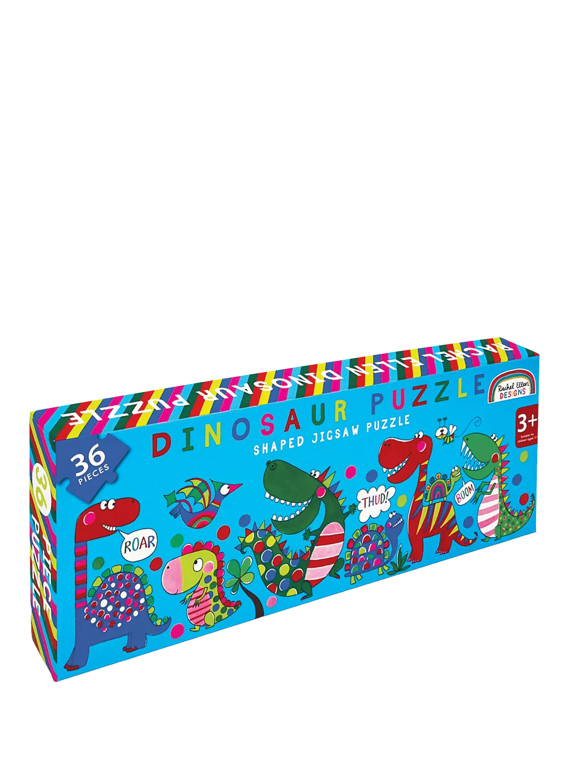 A vibrant jigsaw puzzle in a fun dinosaur design. Packaged in a sturdy box with a printed visual of the puzzle inside containing 36 pieces.