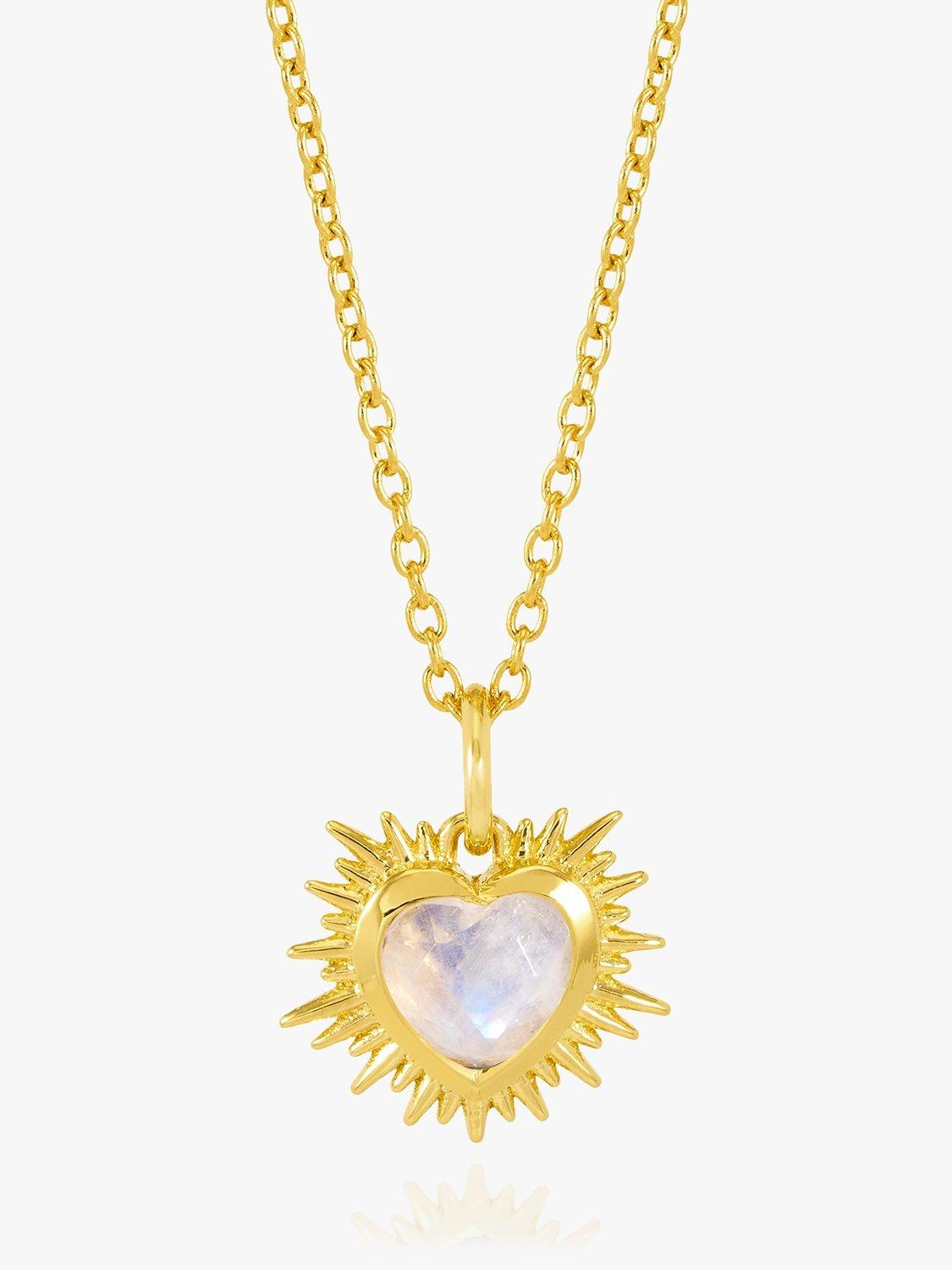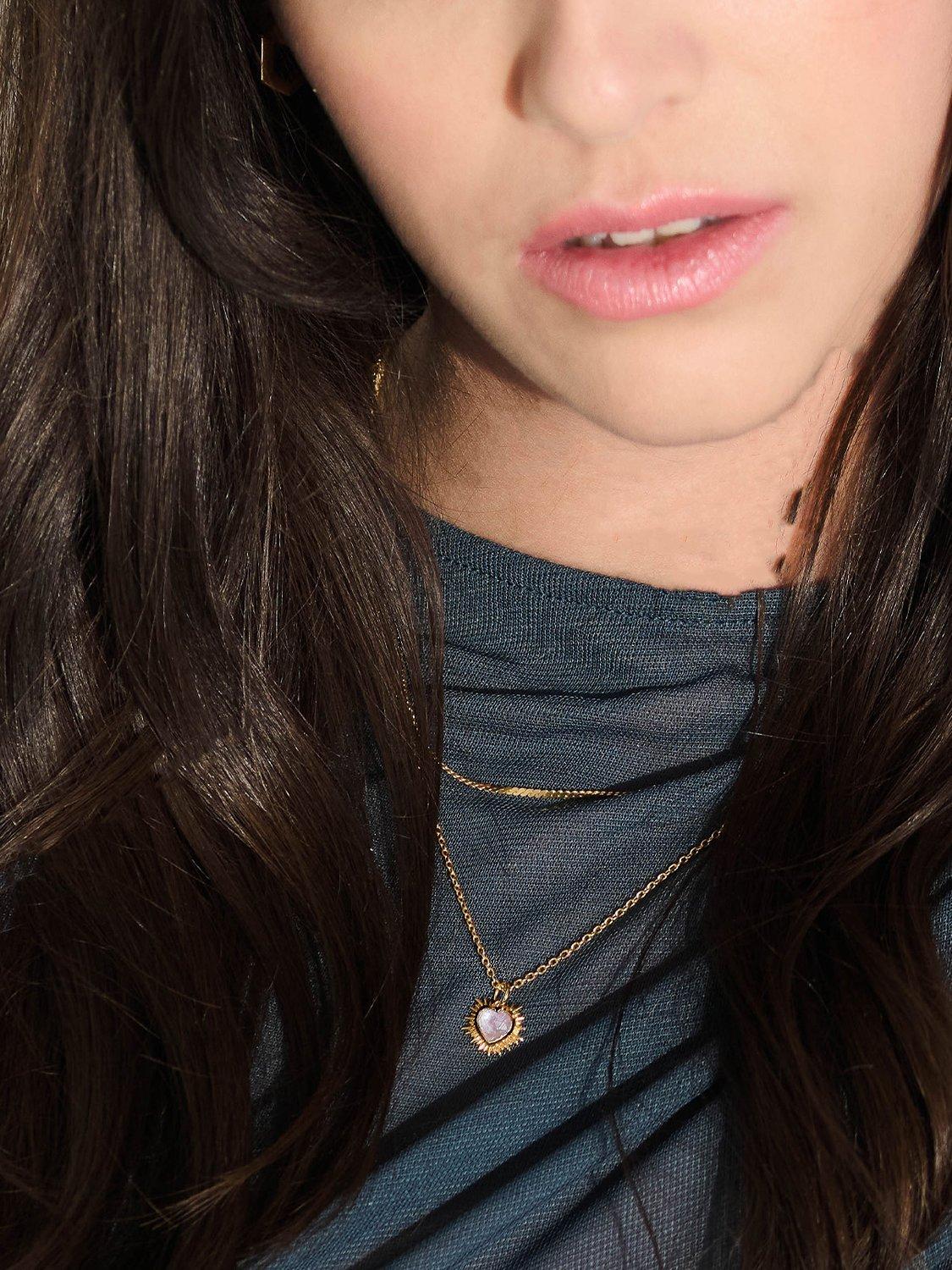 Feel the love in this exquisite heart necklace adorned with hand-carved gemstones and signature Art Deco rays.
