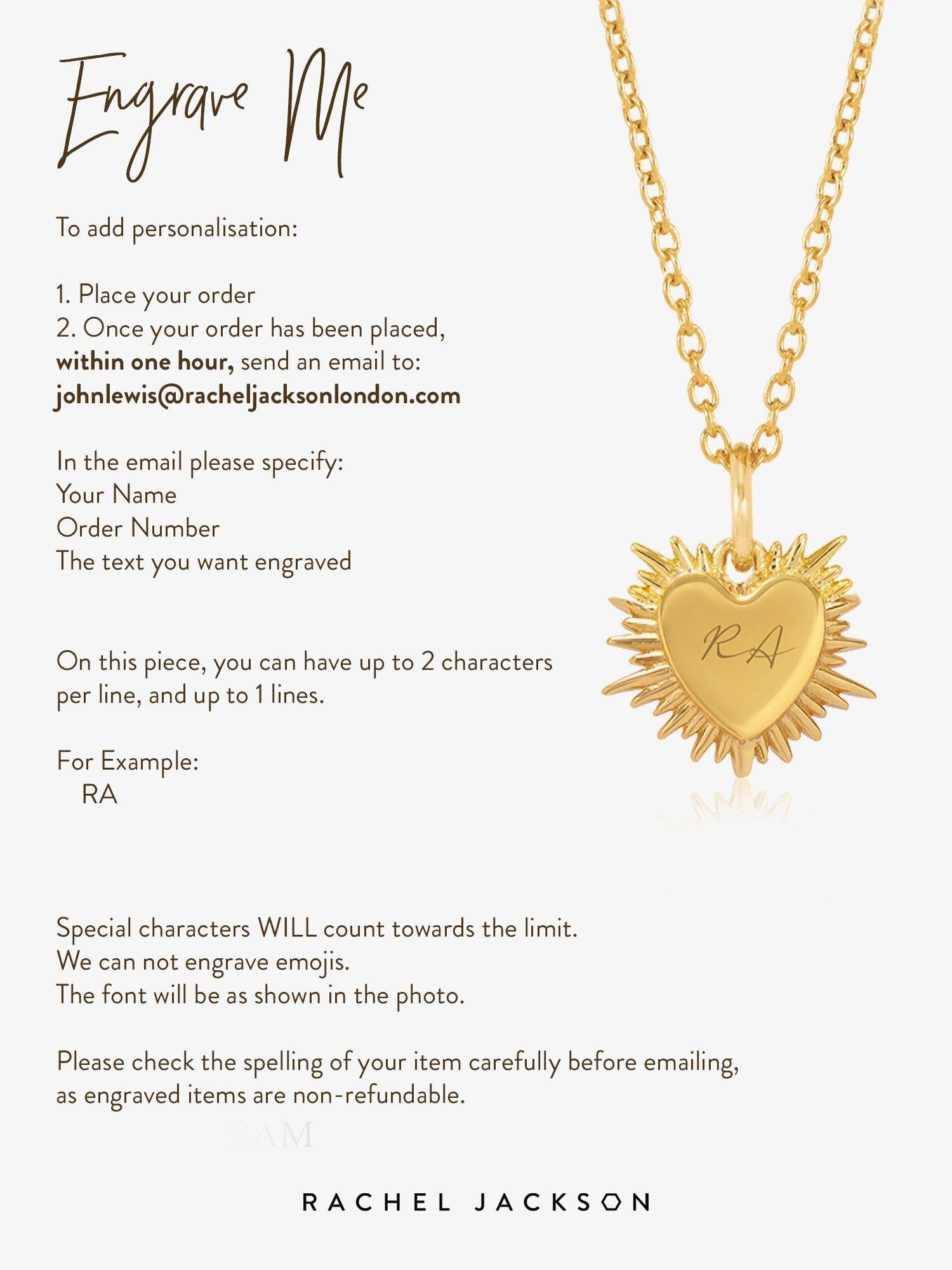 - Once your order has been placed, please send an email to johnlewis@racheljacksonlondon.com with the information you’d like engraved and your order number. This information is necessary for your order to be processed. Please check the spelling of your item carefully before sending.