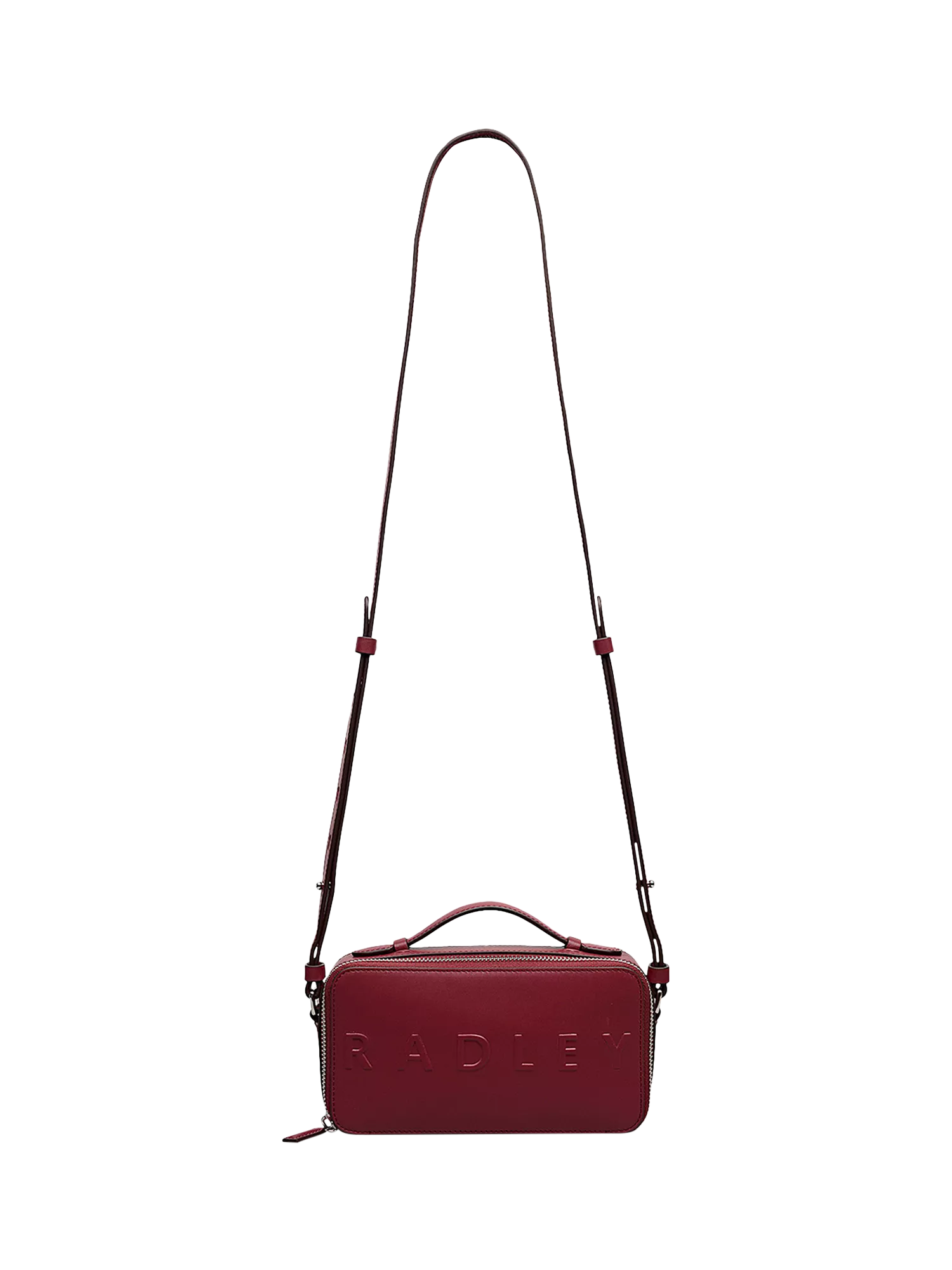 With two zipped compartments and extra pockets, Calvert Road offers just as much functionality as it does style. This mini camera bag is crafted in structured leather with the brand's debossed logo, while the new heritage mark inside adds a signature Radley finish. Designed with a sliding padded top handle, detachable crossbody strap, inserted patch pocket on the back, two compartments, zip fastenings and interior slip pocket. Fits large iPhone or similar device. Comes with a dust bag.