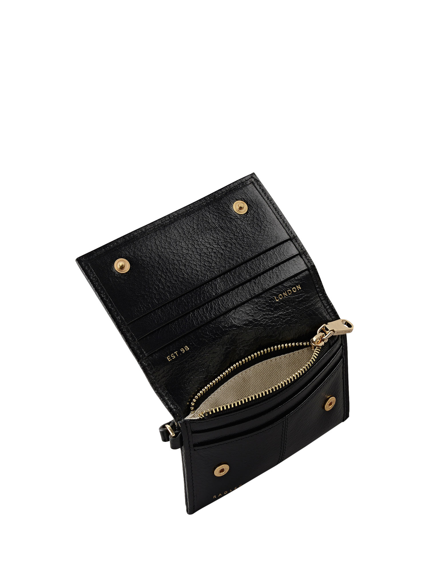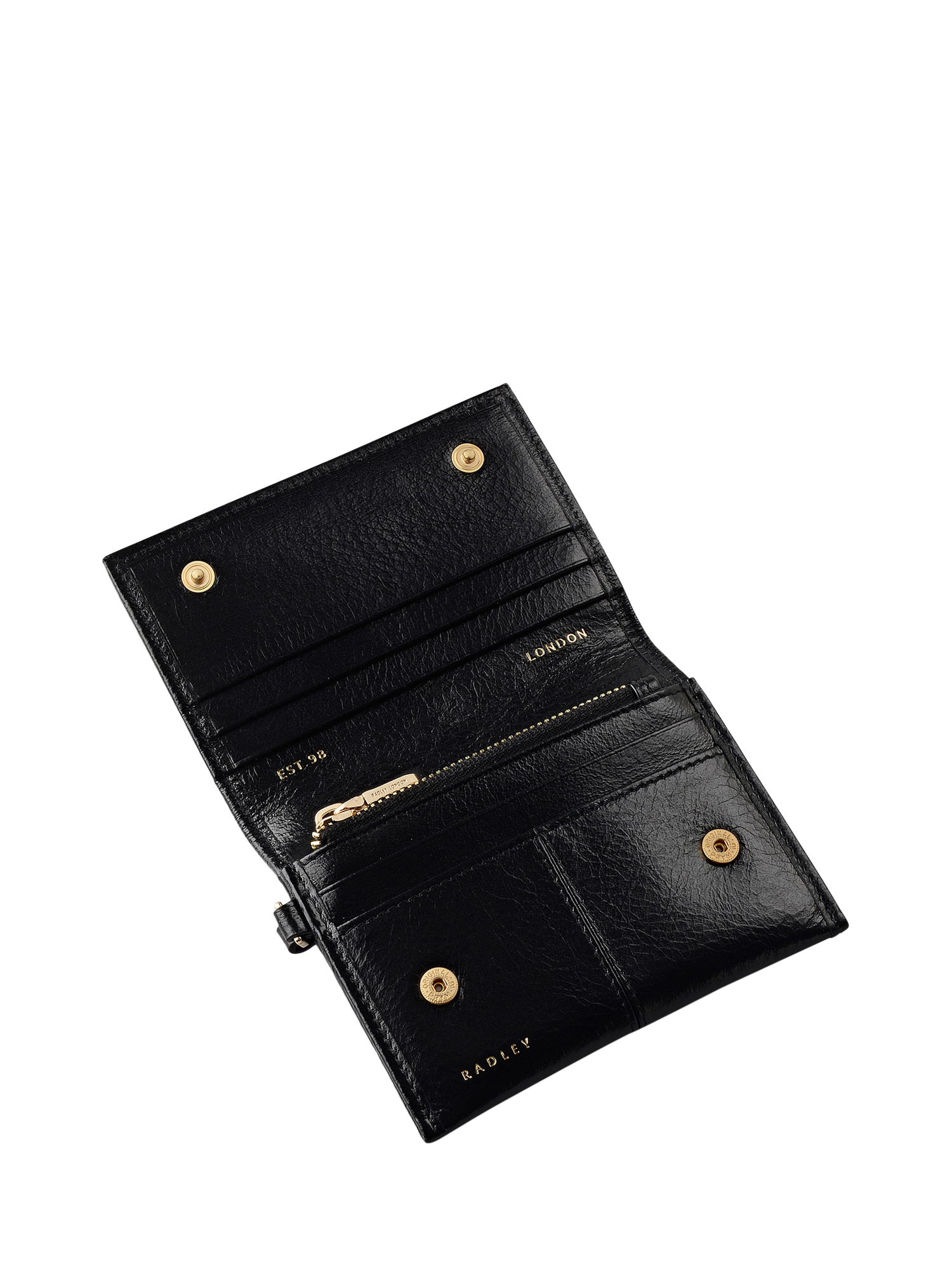 Radley designers chose high-shine leather to create the Chilton Grove medium purse. This slim silhouette is crafted with a central seam, practical interiors with the brand's heritage mark foil embossing and a leather strap that means you can attach it to the handles of your handbag or carry it as a wristlet. Features a flap with press-stud fastening, four interior card slots, interior slip pockets and a zipped coin pocket. Comes with a dust bag.