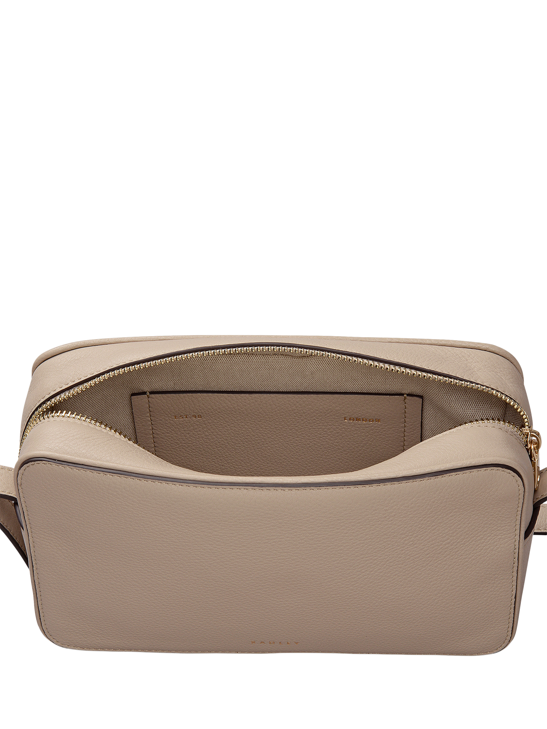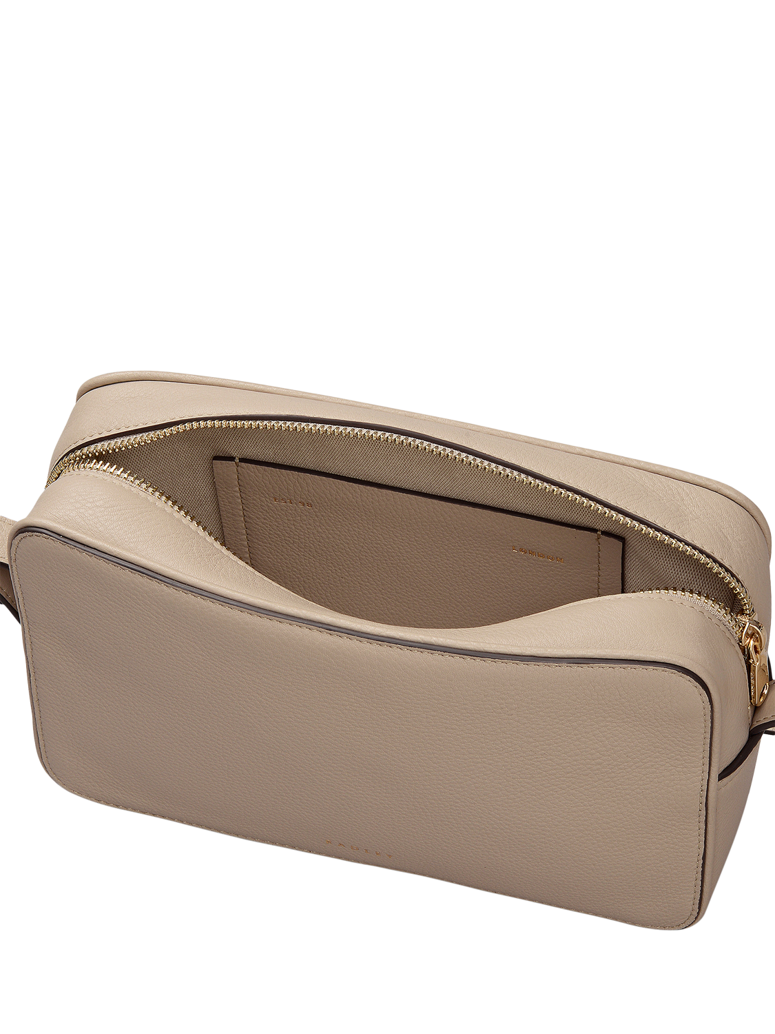 The timeless camera bag is reimagined in the shape of Duchess Close. This slim, boxy day bag is crafted with soft leathers and framed with inset piping and painted cut edges. A wardrobe staple. Designed with an adjustable cross body strap, slip back pocket, and zip fastening. Comes with a dust bag.