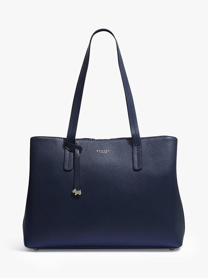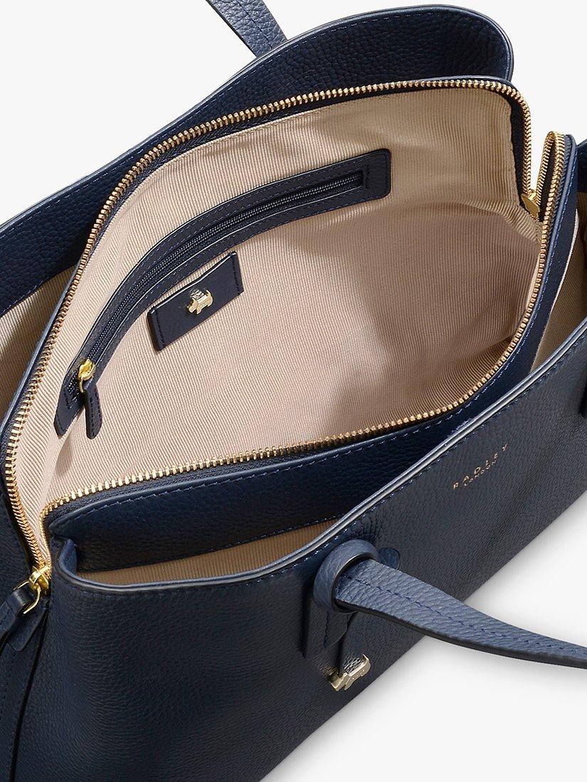 A style staple for the working week, the Dukes Place open top bag from Radley is beautifully crafted from grainy leather that will last for years to come. Made for keeping your essentials in check, the double zip opens to reveal a fully lined spacious central compartment with a zipped interior pocket, while either side of the main compartment features two smaller slip pockets. Complete with a cute Radley dog charm, you can rest this design on your shoulder and be on your way.